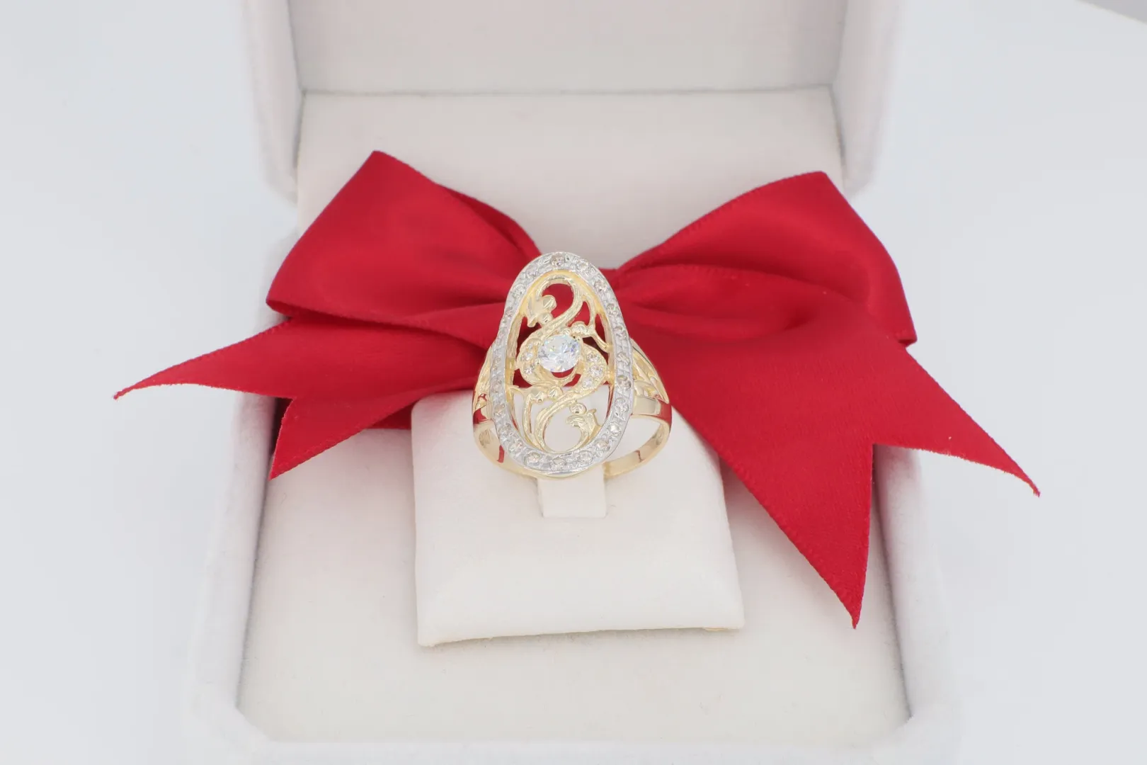 Kéttónusú, Részletgazdag Dizájn: Sárga arany és ródiumozott, köves motívumok.
