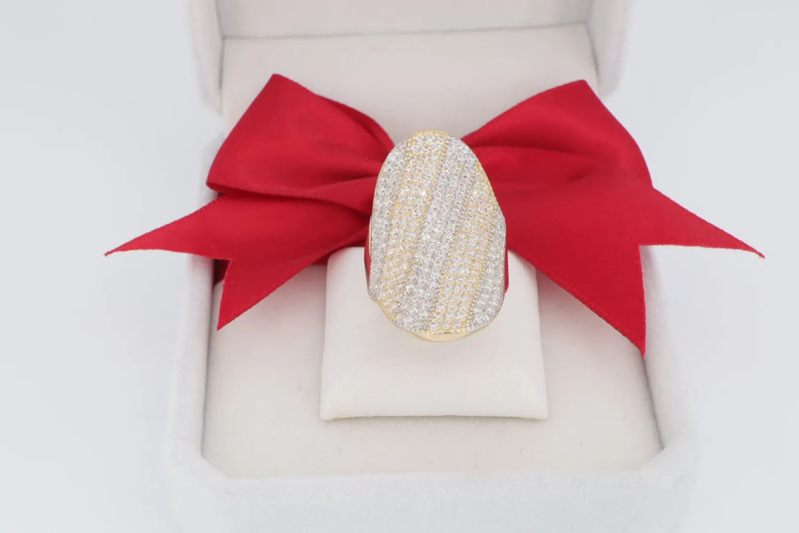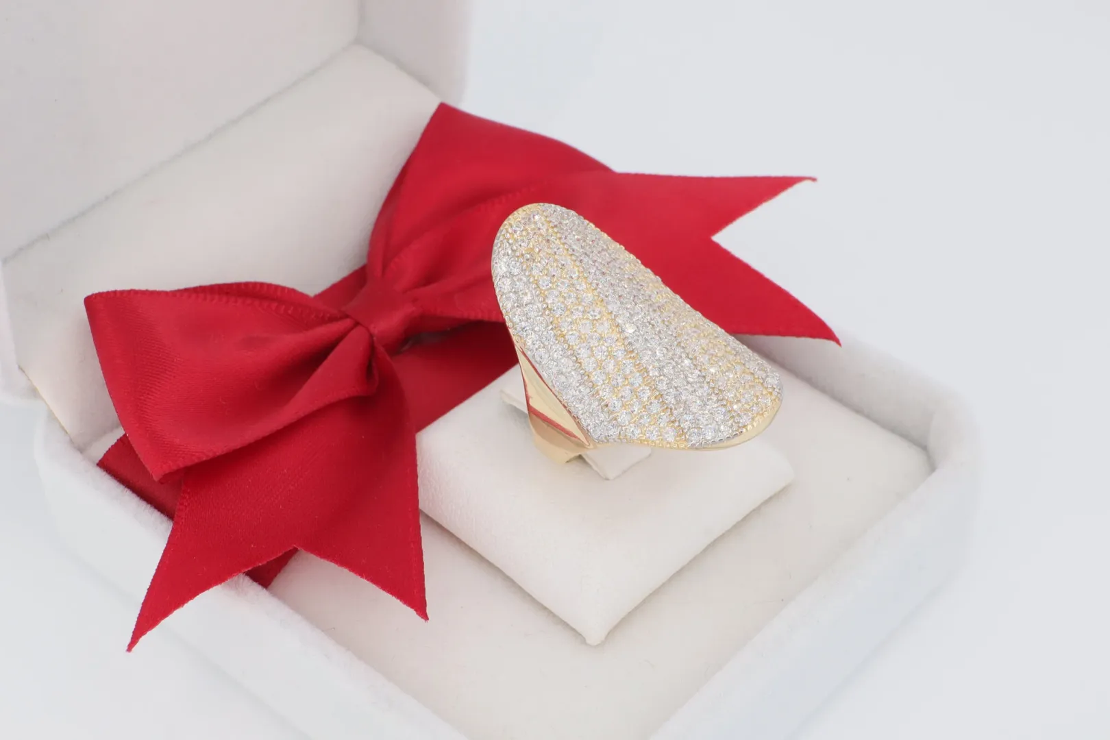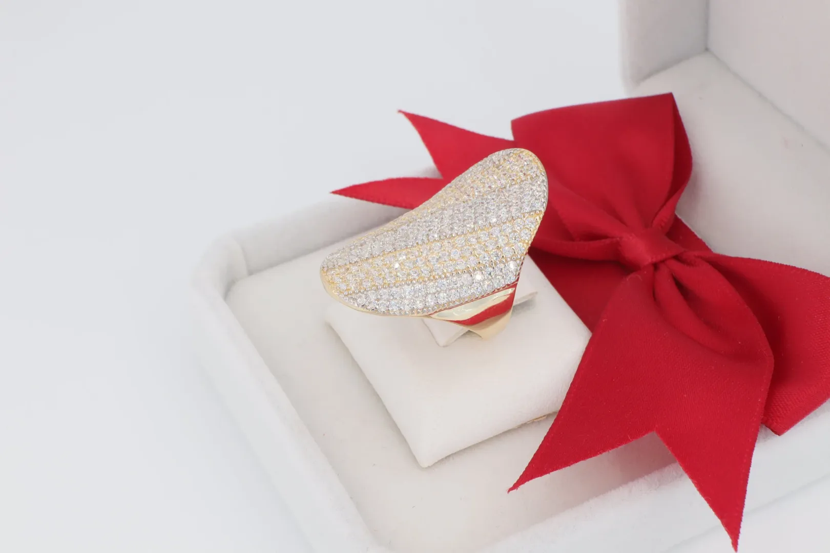 Ez a nagyméretű, különlegesen formázott 14 karátos sárga arany gyűrű nem csupán egy kiegészítő, hanem a stílus megtestesítője. A gyűrű felső, ovális alakú része teljes egészében ragyogó cirkónia kövekkel van beborítva, ami egyedülálló, fénylő textúrát hoz létre.
