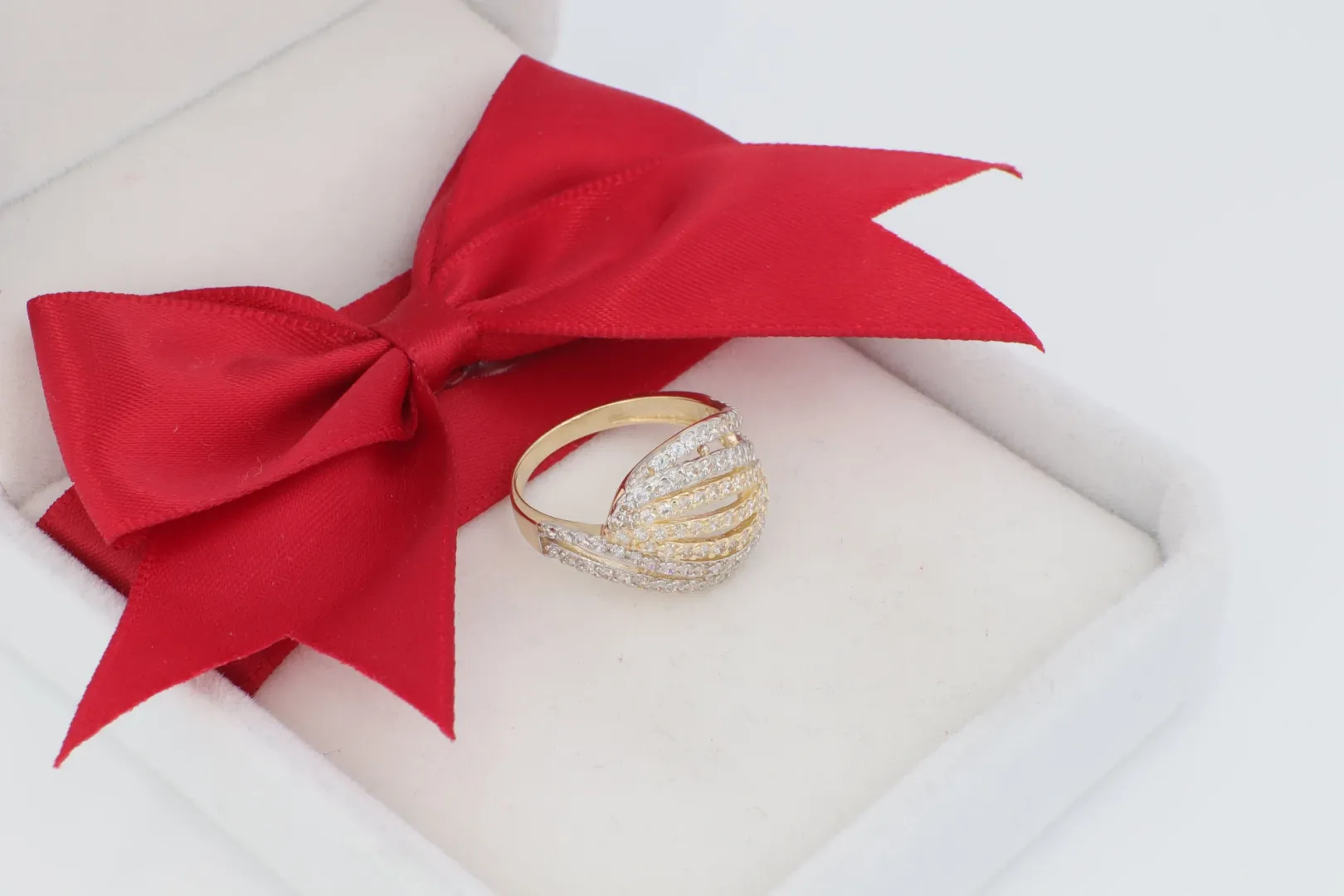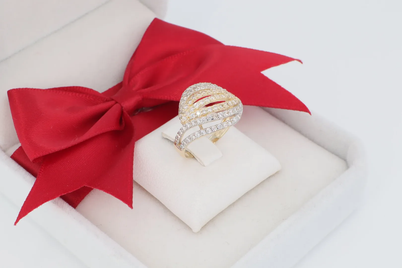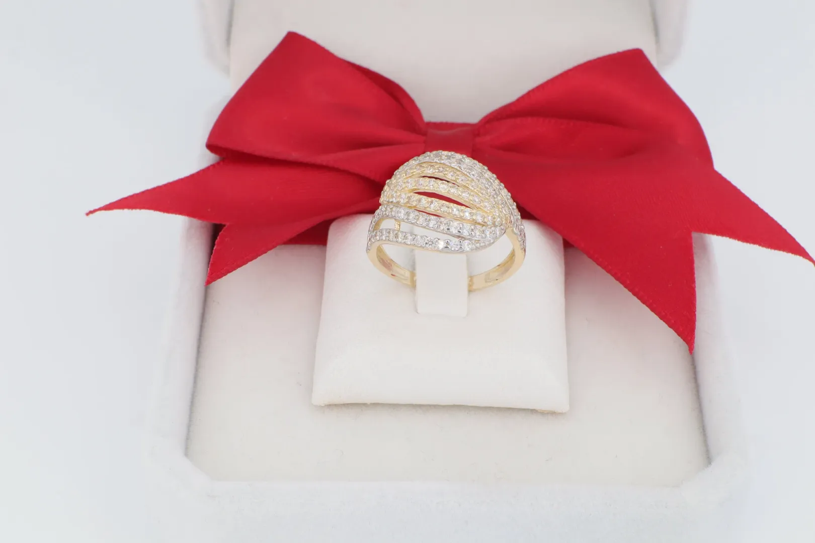 A 14K arany alap garancia az időtállóságra és az értékre. A gyűrű designja a hullámzó formákat utánozza, melyek a legfinomabb ragyogással borítják be a kézfejet. A kövek aprólékos, sűrű elhelyezése és a fehér ródium bevonat maximalizálja a "gyémánt hatást", rendkívül fényűző megjelenést kölcsönözve a női ékszernek.