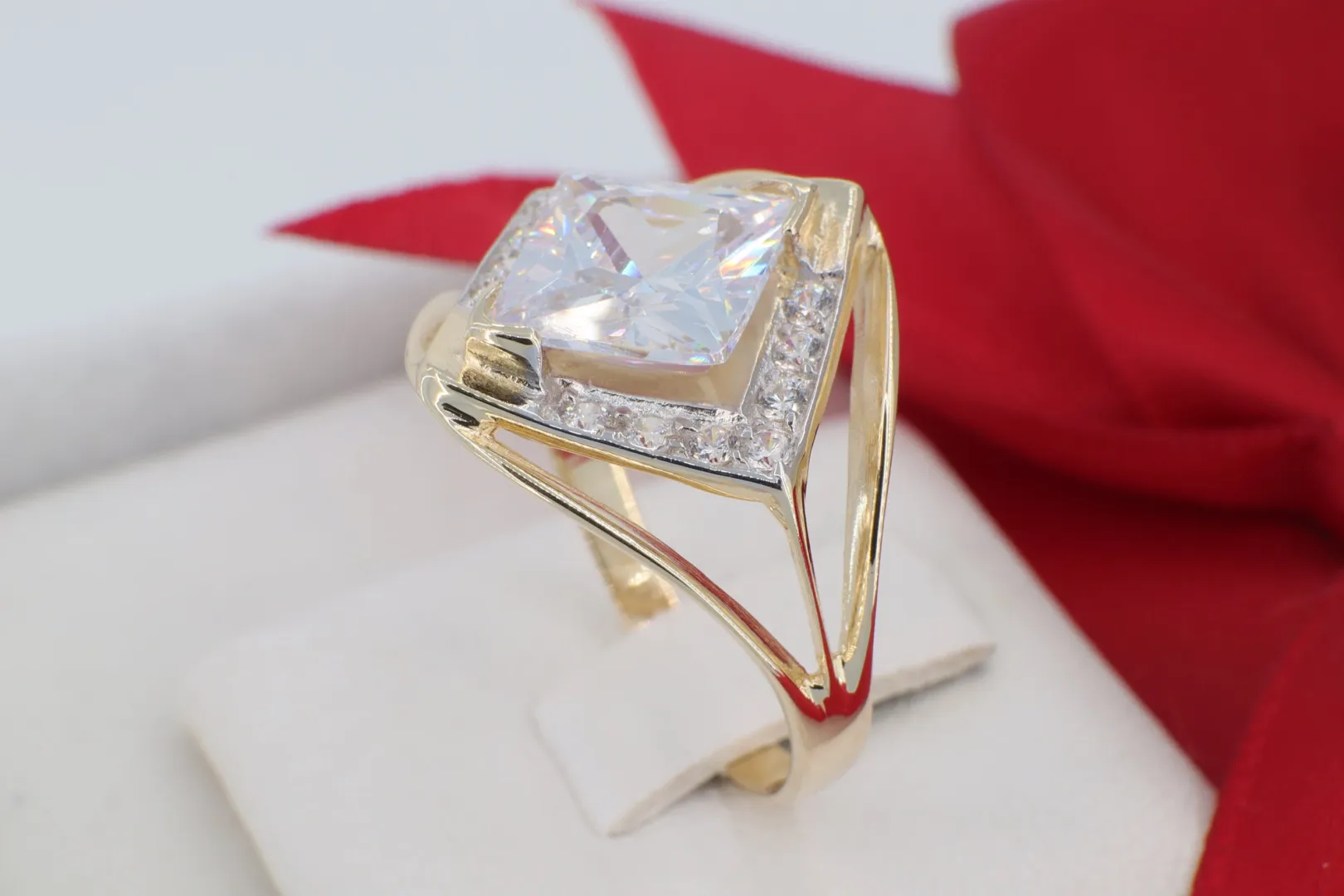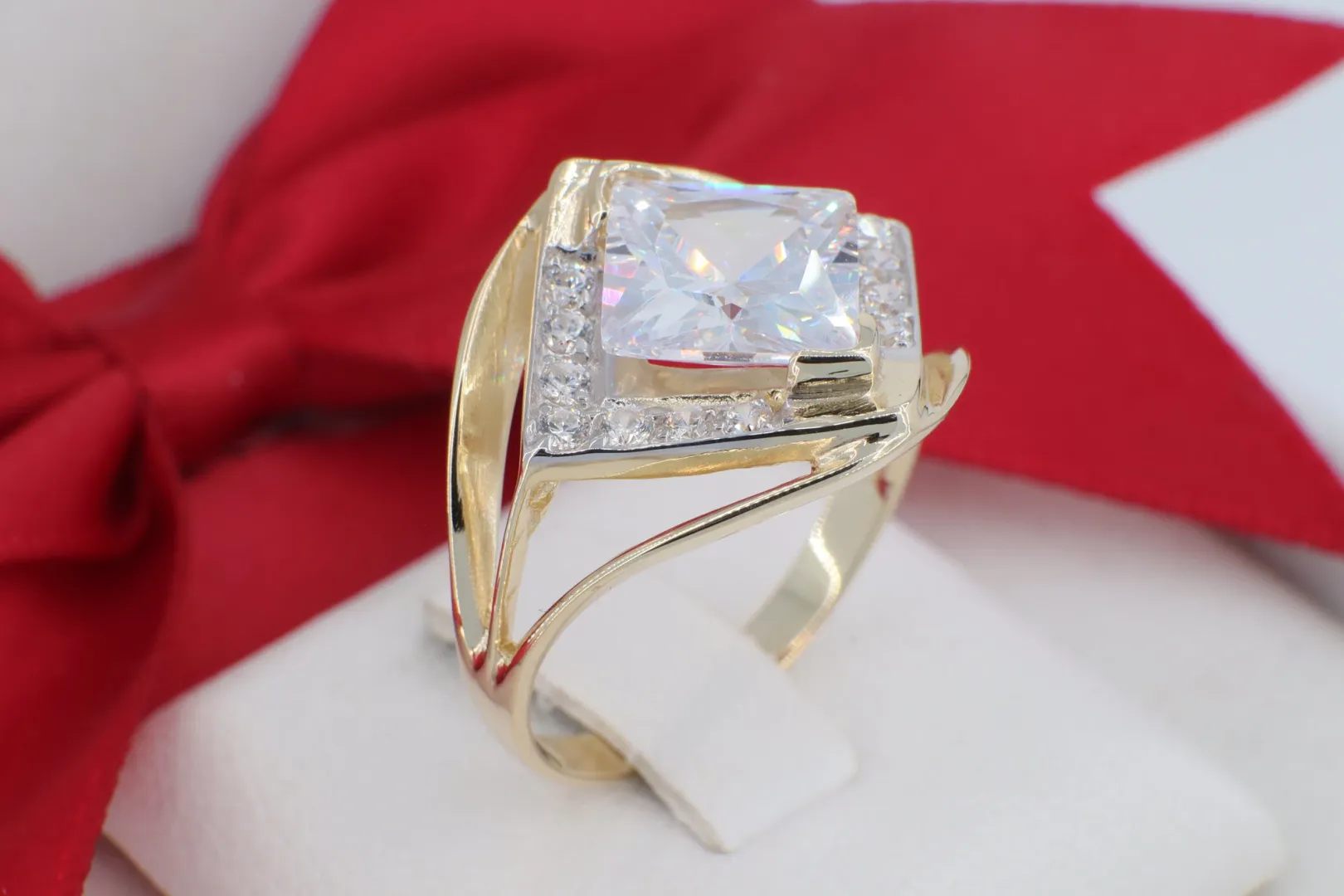 A GY0277-es modellszámú, 14 karátos arany gyűrű a modern luxus és a határozott elegancia megtestesítője. Az ékszer fókuszpontjában egy nagyméretű, négyzet alakú (princess csiszolású) cirkónia kő tündököl, amelyet egy különleges, rombusz alakú keret ölel körbe. Ez a geometrikus kialakítás nemcsak vizuálisan nagyítja az ékszert, hanem egyfajta építészeti szépséget is kölcsönöz neki. A keret éleit apró, precízen foglalt cirkónia kövek díszítik, amelyek minden szögből visszaverik a fényt, garantálva a káprázatos megjelenést.