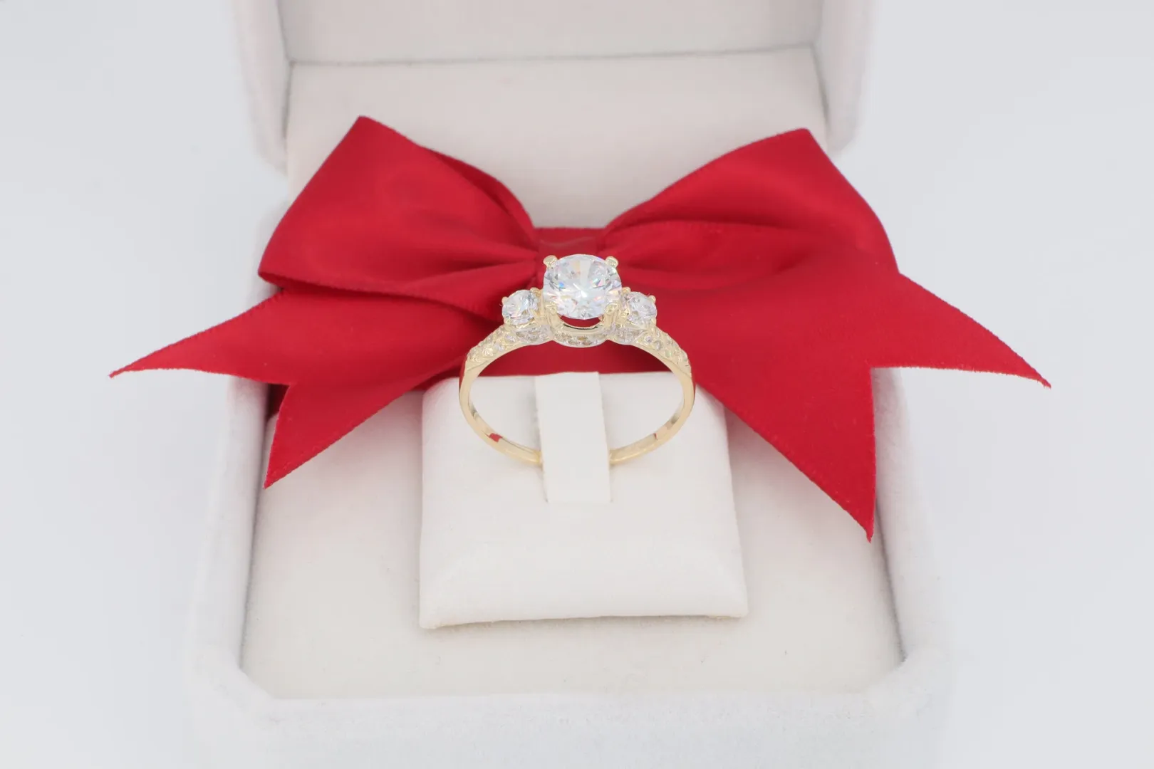 Ez a ragyogó 14 karátos sárga arany gyűrű (585‰ finomság) a "múlt, jelen és jövő" szerelmét szimbolizáló, klasszikus háromköves (trilógia) designnal készült. A gyűrű minden szögből ragyogó, feltűnő és elegáns megjelenést kölcsönöz.