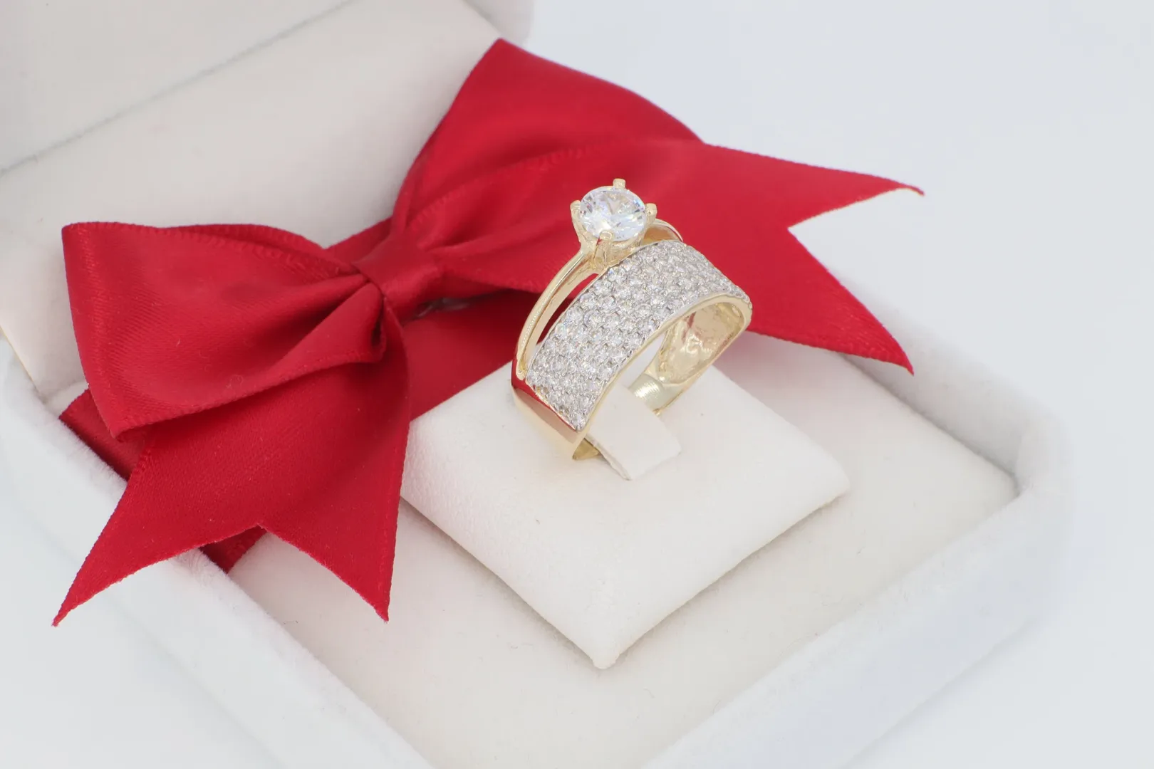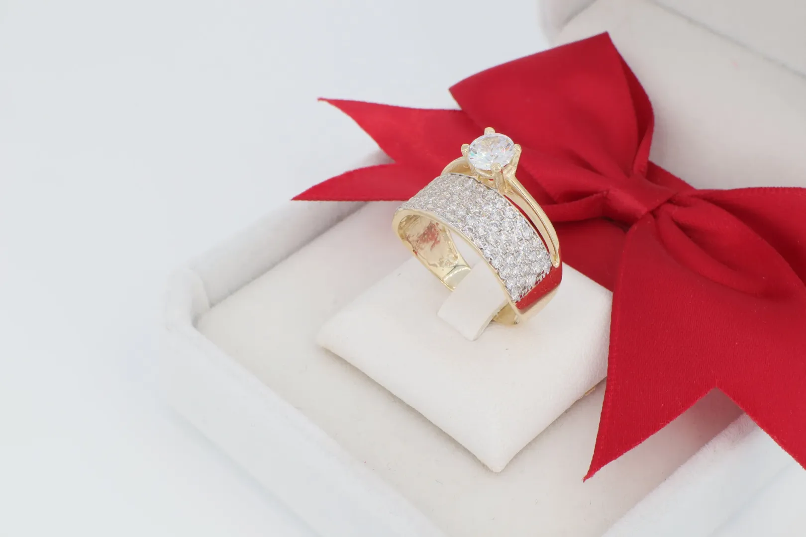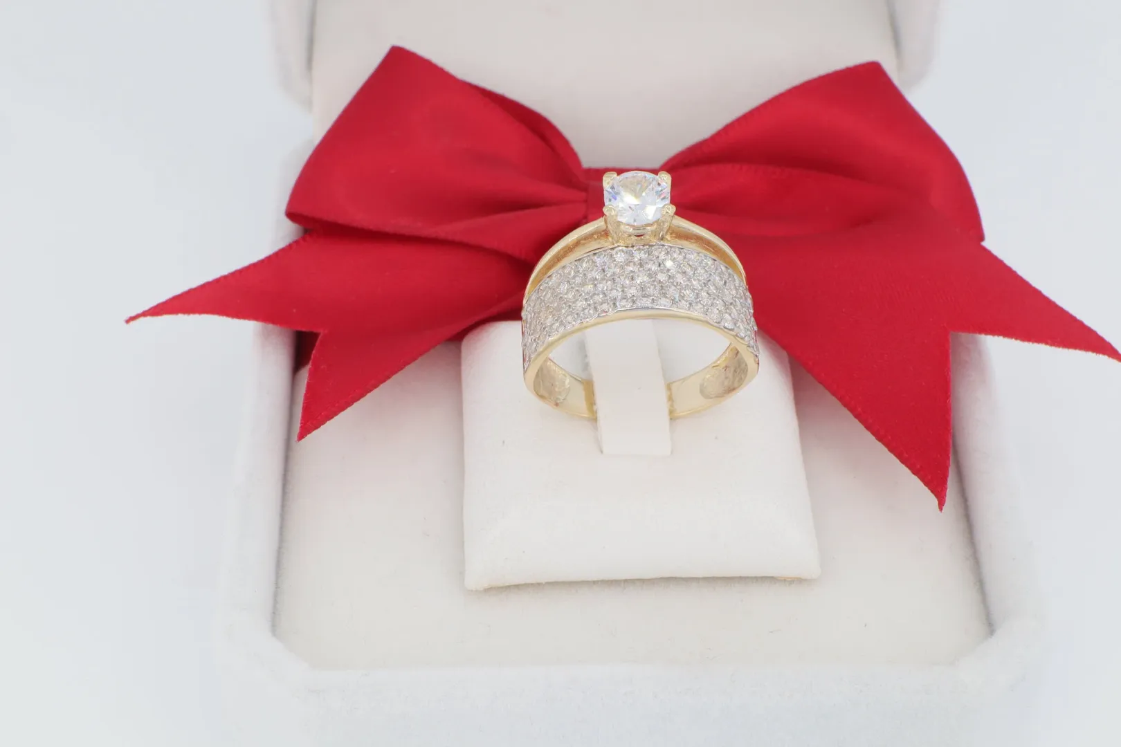 Luxus Pavé Sáv: A fő kő alatt egy széles, feltűnő gyűrűsín húzódik, melynek teljes felülete apró, sűrűn foglalt cirkónia kövekkel van kirakva (pavé foglalat). Ez a rengeteg csillogó kő ródium bevonatú felületen ül, maximalizálva ezzel a fényvisszaverődést és a drámai ragyogást. A ródiumozás egyben kontrasztot képez a sárga arannyal, és kiemeli a kövek fehérségét.