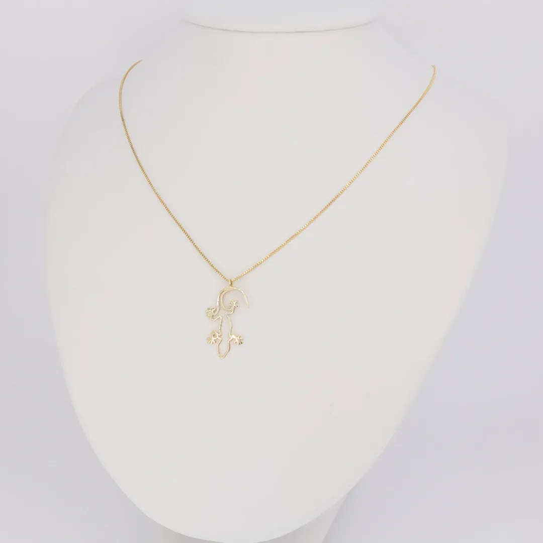 Ez a 14 karátos arany nyaklánc a megújulás, az alkalmazkodóképesség és a szerencse egzotikus szimbóluma. A medál egy stilizált gekkó körvonalát ábrázolja, melynek finom, áramló vonalvezetése művészi és modern hatást kelt. A gekkó motívum nem csupán divatos kiegészítő, de a jó szerencse és a túlélés jelképe is. Ez az ékszer ideális azok számára, akik szeretik a természet ihlette, szimbolikus jelentéssel bíró és egyedi megjelenésű darabokat.