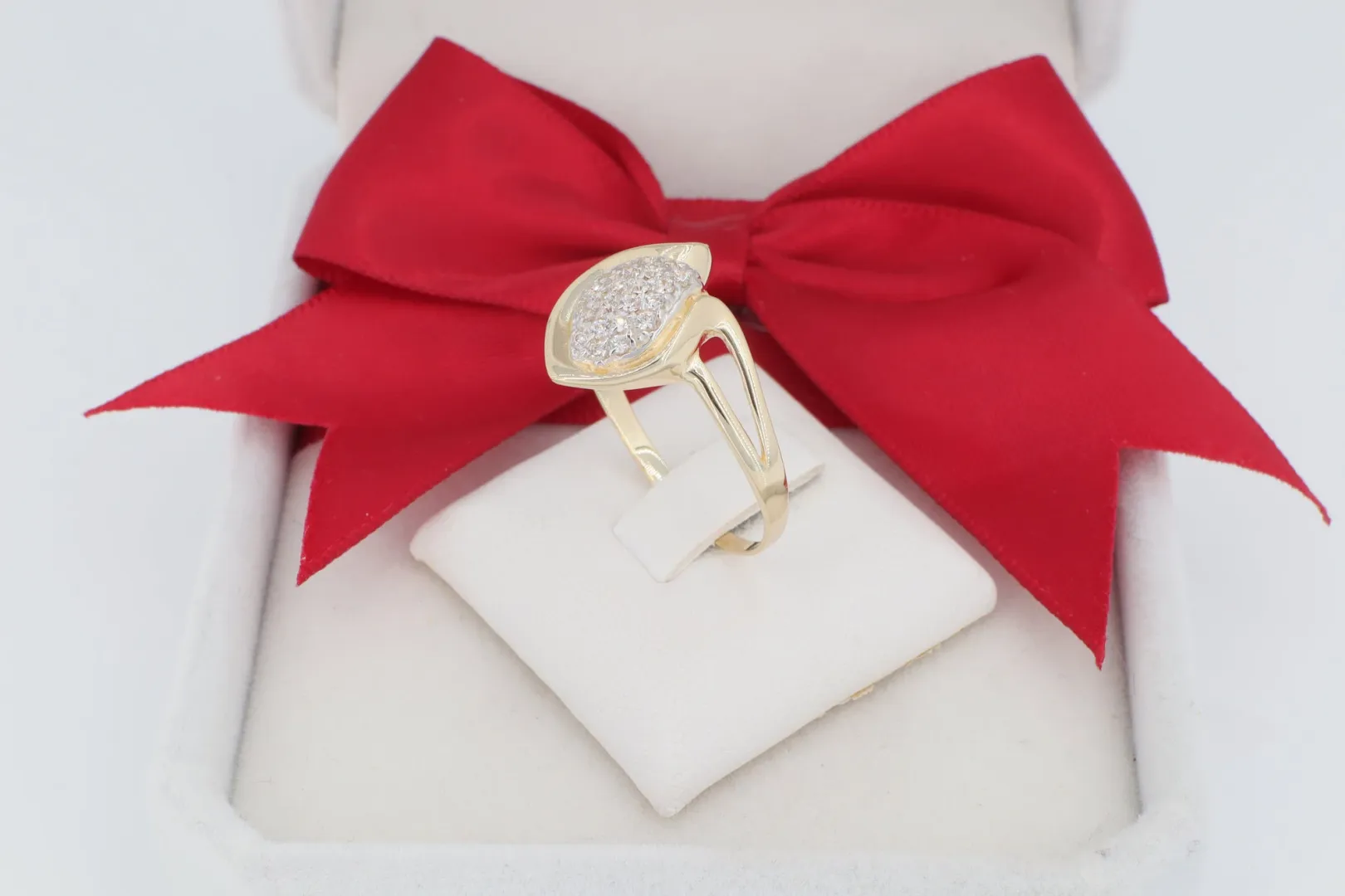 Design: Csepp/Mandula Alakú Gyűrűfej – A gyűrű feje egy körte designra emlékeztető, finoman ívelt formában teljesedik ki. A központi forma apró kövekkel van díszítve, melyet egy sima, polírozott arany keret ölel körül.