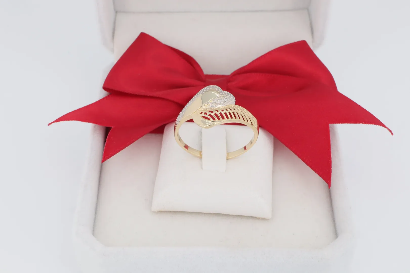 A gyűrű fejrészét két, egymást lendületesen átölelő ív alkotja, amelyek egy dinamikus hullám motívumot formálnak. Az ív kéttónusú, sárga arany alapon fehér arany hatású (ródiumozott) recézett mintázattal van díszítve, amely textúrát és kontrasztot ad a női arany gyűrűnek.
