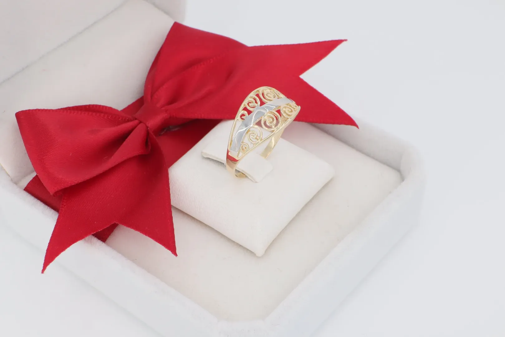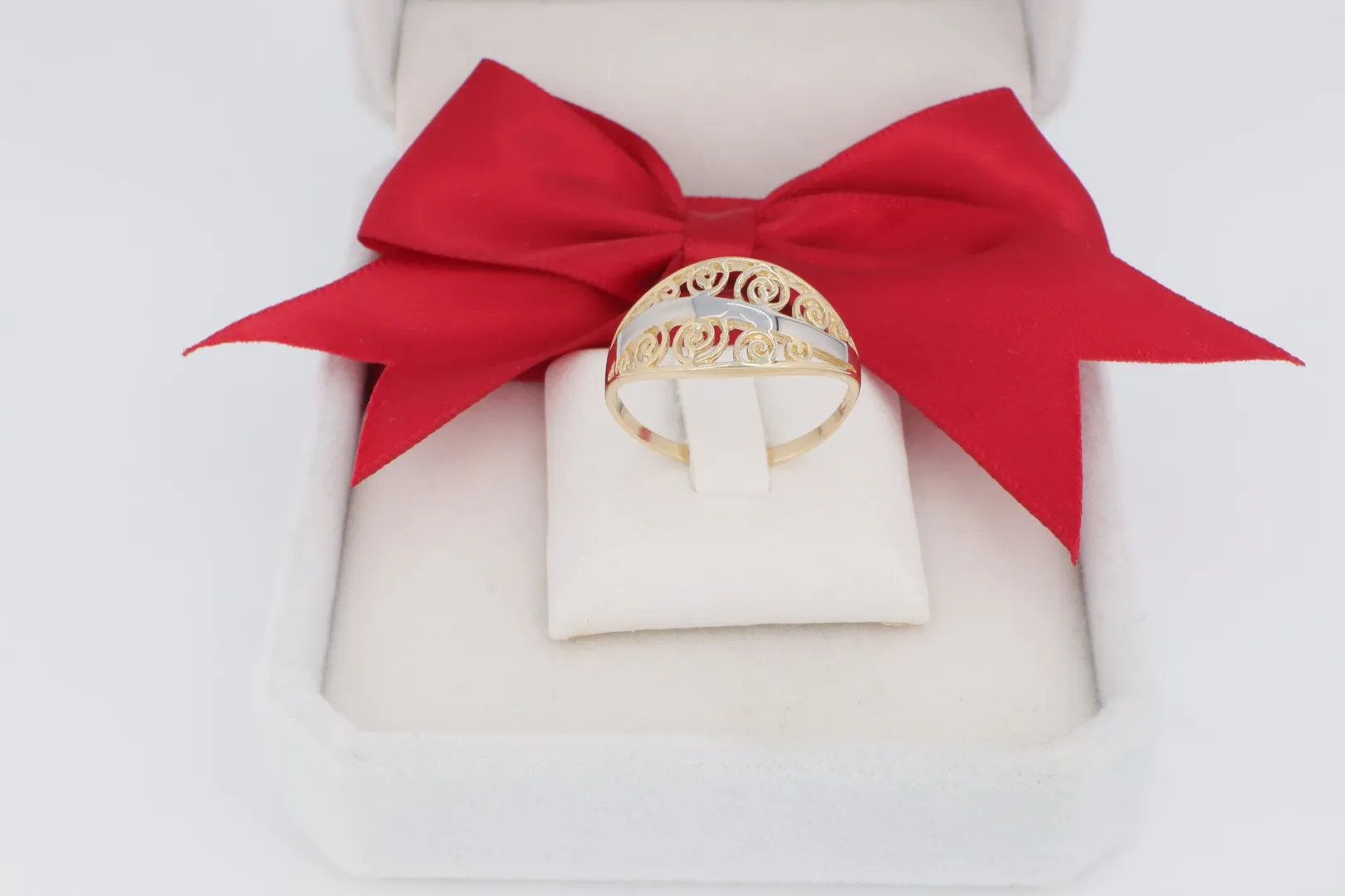 Ez a női arany gyűrű egy igazi karakteres és hangsúlyos darab, amely tökéletesen illeszkedik azokhoz, akik a klasszikus motívumokat kedvelik modern, kéttónusú kivitelben.