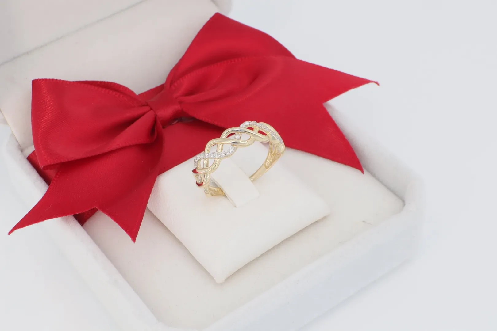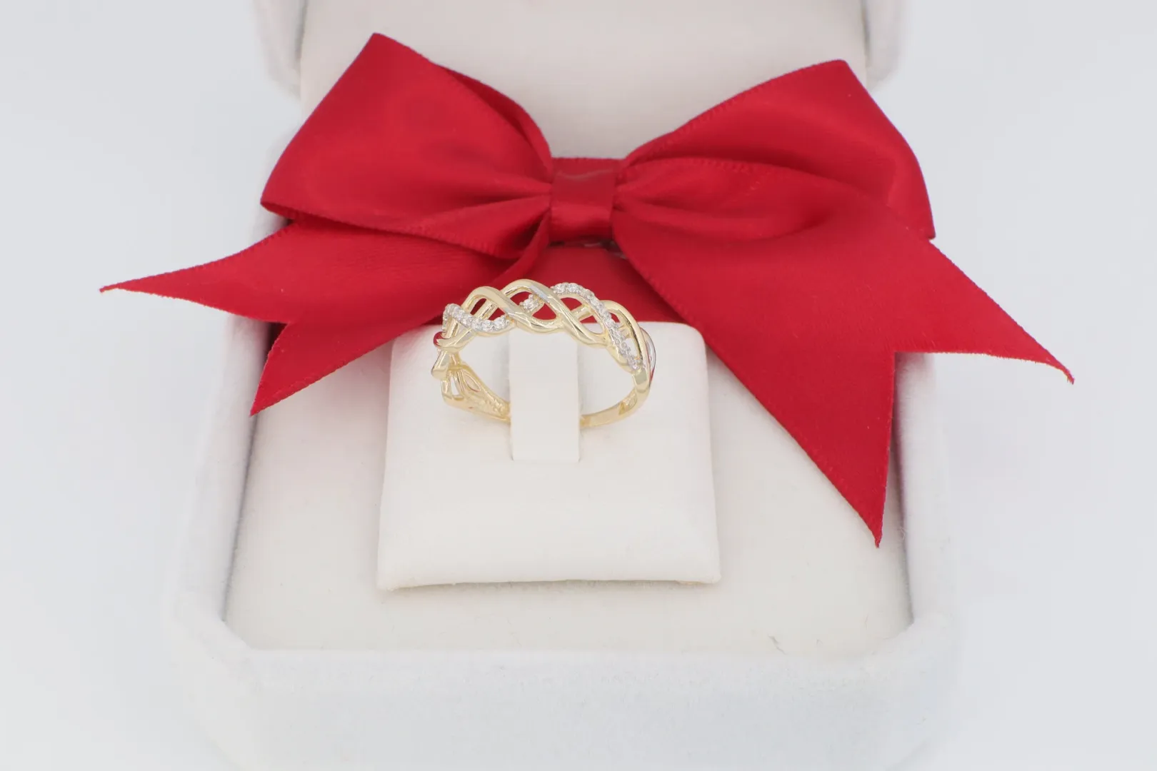 A GY1644 -14 karátos arany gyűrű a kecses vonalvezetés és a finom csillogás ideális ötvözete. A gyűrű feje több vékony, egymást lágyan keresztező sávból áll, amelyek egy elegáns, fonott mintázatot (ún. "infinity" vagy fonat dizájnt) hoznak létre.