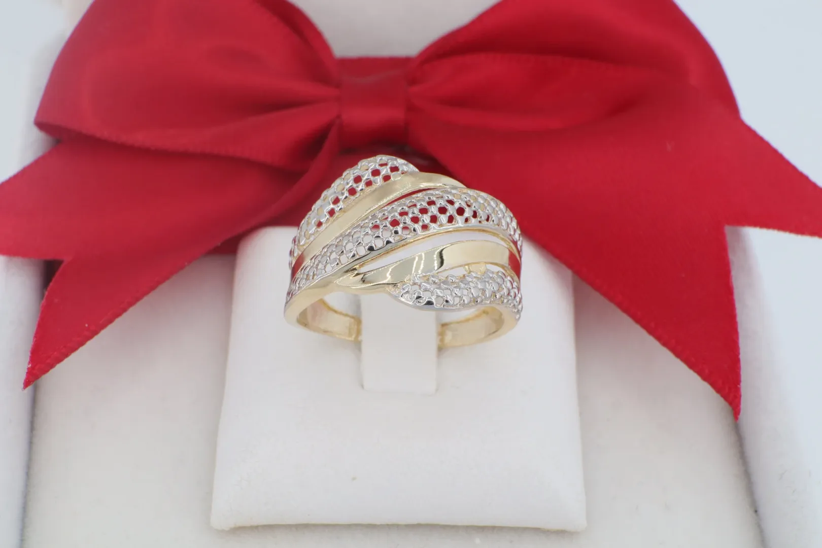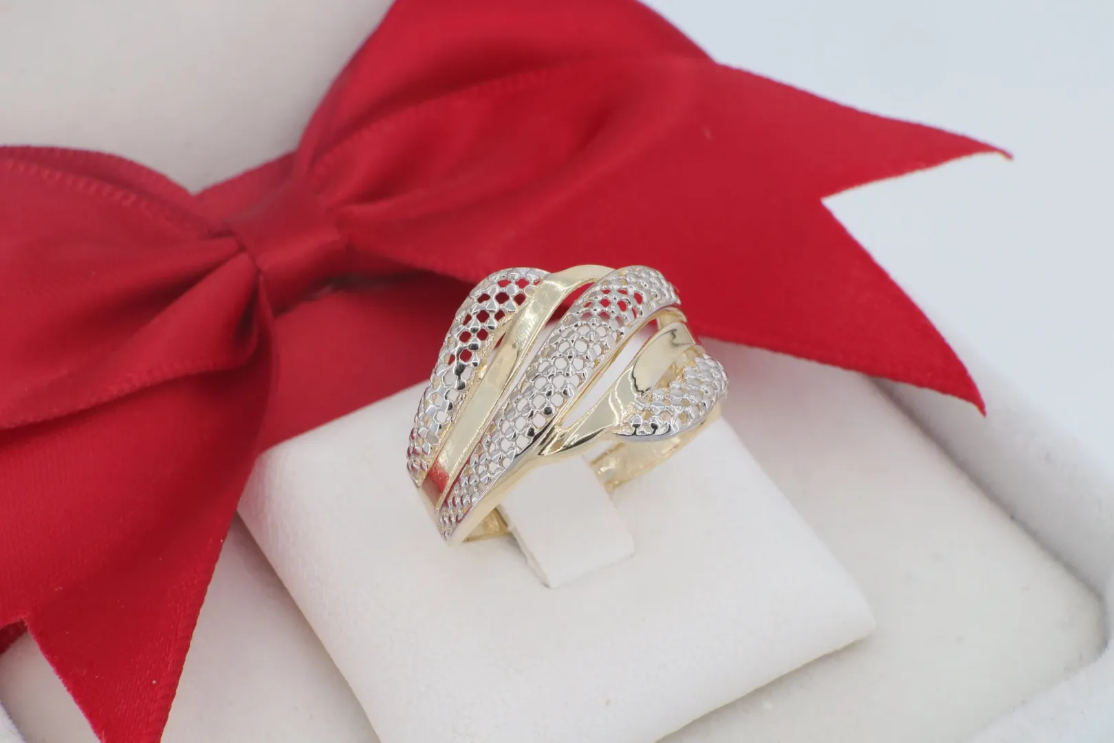 Fonott Mintázatú 14 Karátos Arany Gyűrű Ródiumozott Díszítéssel (gy1641)