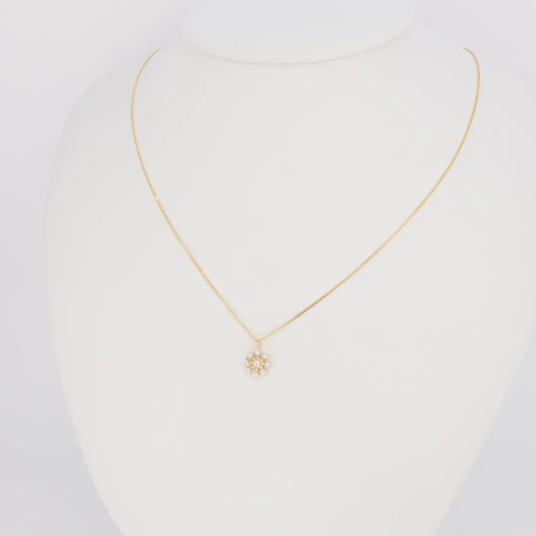 Ez a 14 karátos arany nyaklánc a tél, az ünnepek és a finom elegancia elbűvölő szimbóluma. A medál egy stilizált virág vagy hópehely motívumot ábrázol, melynek szirmai/ágai váltakozó színű sárga és fehér aranyból készültek. A motívum közepén és a fehér arany részeken apró, briliáns csiszolású cirkónia kövek helyezkednek el, amelyek a fagyos csillogást idézik. A kétszínű arany kombinációja és a kövek szikrázása teszi ezt a darabot különlegessé és feltűnővé.