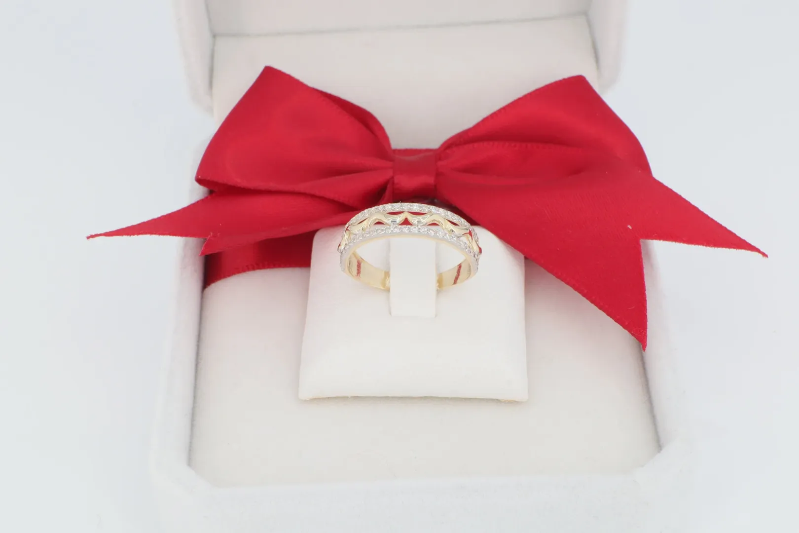 A gyűrű két vékony, cirkóniával díszített szegély között helyezkedik el, amelyek kiemelik a középső, sárga aranyból készült, hullámzó mintát. A sávok és a kövek kombinációja látványos, de mégis kifinomult összképet teremt.