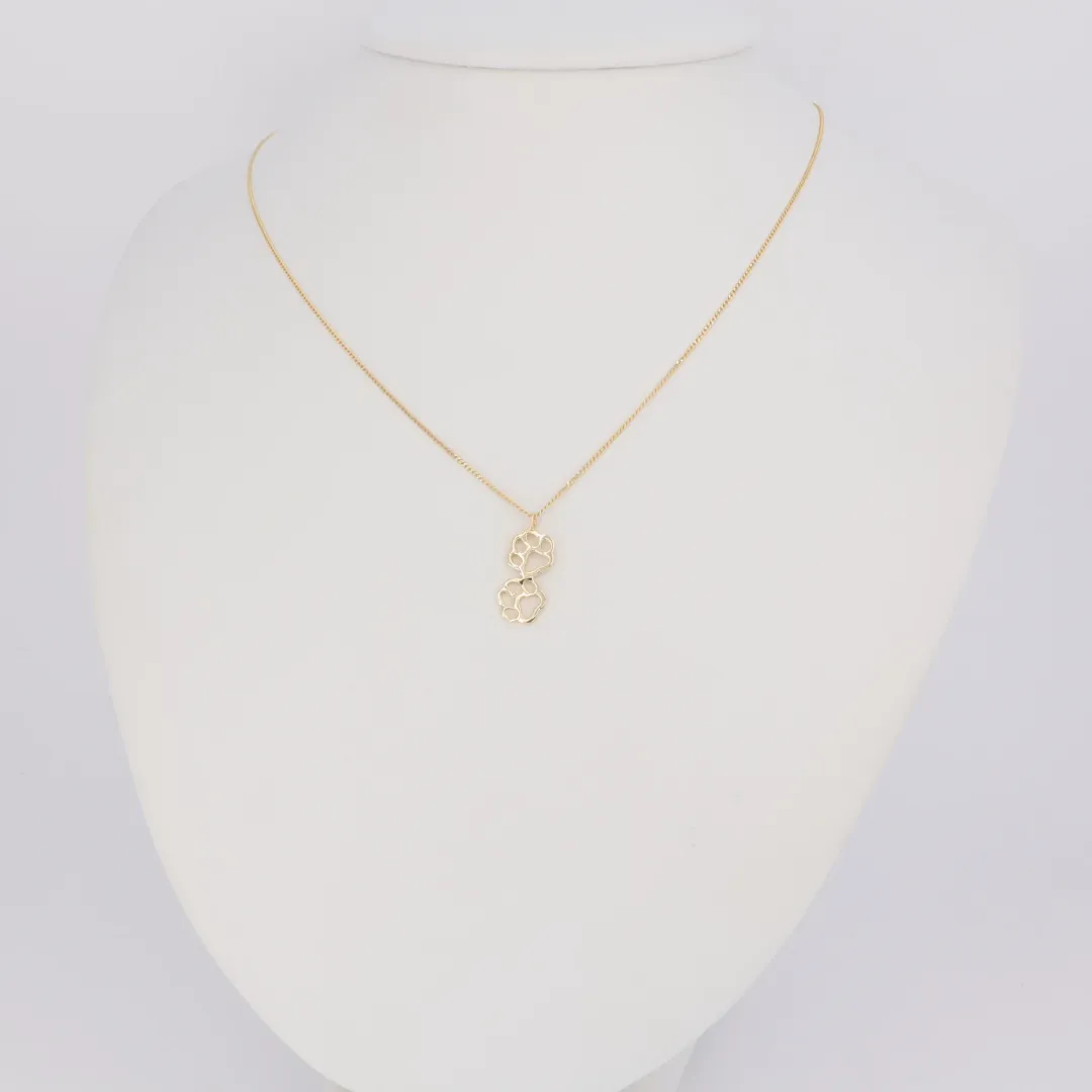 Az ékszer anyaga hitelesített 14 karátos sárga arany (585‰ finomságú), melynek vékony, polírozott lánca finoman tartja a duplán álló mancs motívumot. A két lábnyom egymásra helyezése dinamikus, mélységet ad a medálnak.