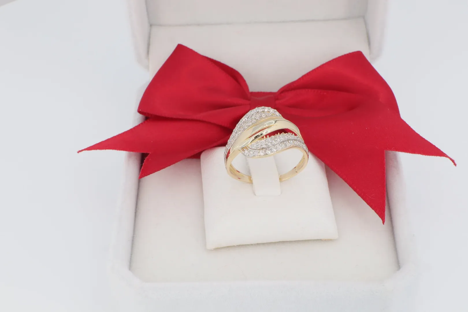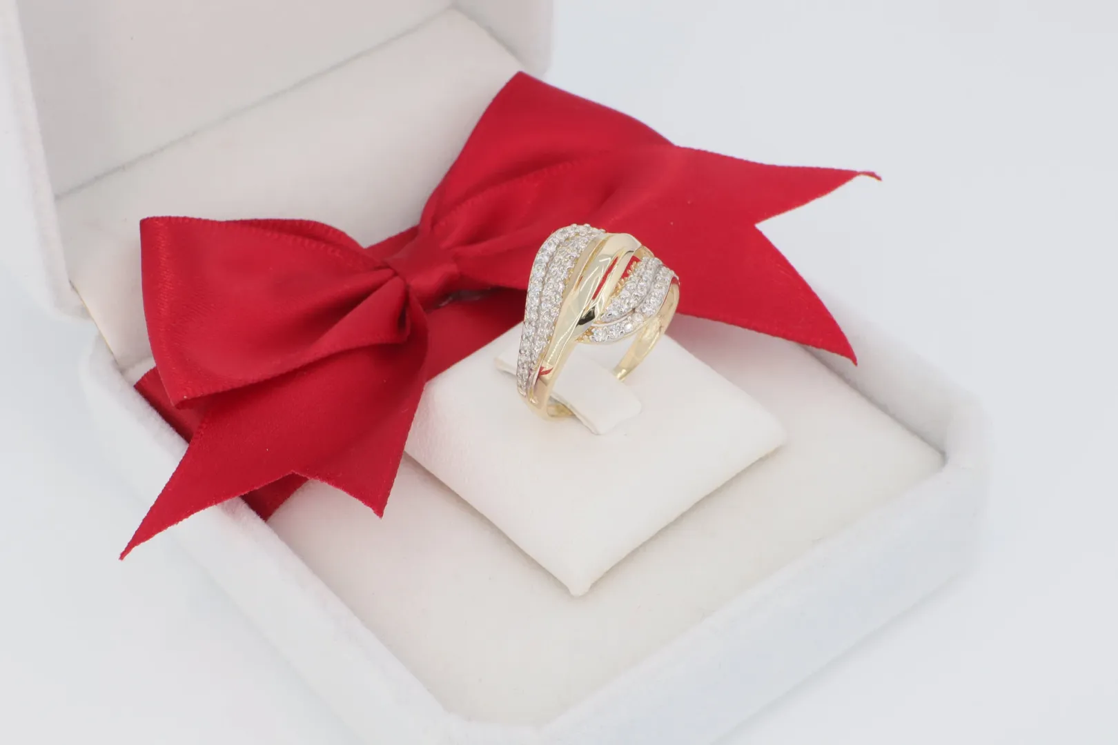 A gyűrű sínje masszív, amelyen a fejrész kialakítása három, egymást részben keresztező, hullámzó sávból áll. A sávok közül kettő sűrűn sorba foglalt, ragyogó cirkónia kövekkel van borítva, míg a középső (vagy egyik belső) sáv polírozott, tükörsima aranyból készült. Ez a kialakítás gazdag texturális kontrasztot teremt az arany meleg fénye és a kövek vakító csillogása között. A sávok lendületes, áramló formája mozgást és dinamikát visz a széles kialakításba.