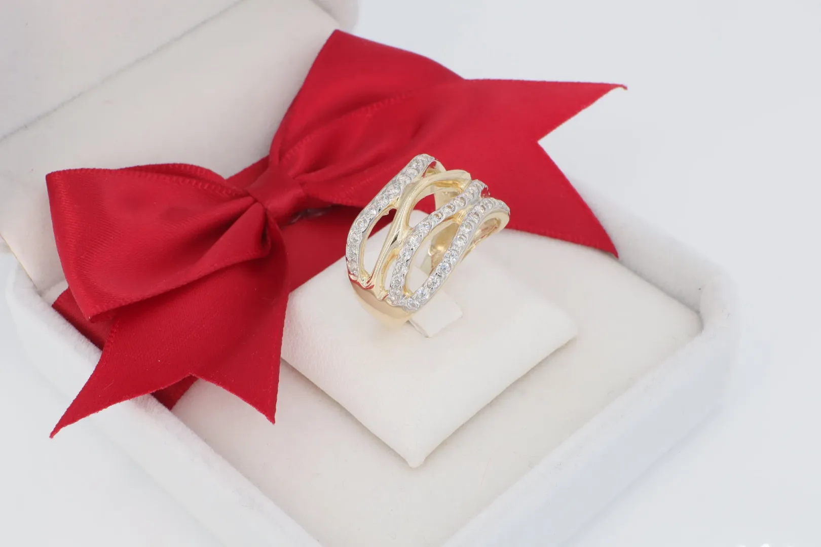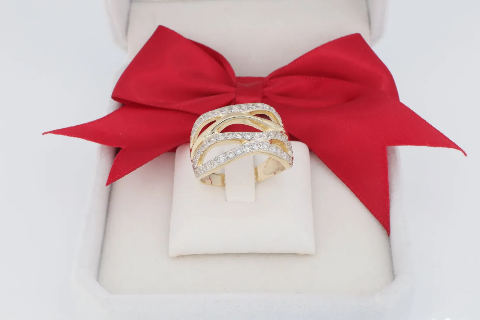 A GY0054 -14 karátos arany gyűrű a kortárs ékszerdivat egy ragyogó példája. A gyűrűfej egy áttört, négy egymással párhuzamosan futó, ívelt sávból épül fel, amelyek a nagy méret ellenére is könnyed és szellős hatást keltenek. Ez a dinamikus, többdimenziós kialakítás azonnal magára vonja a figyelmet.
