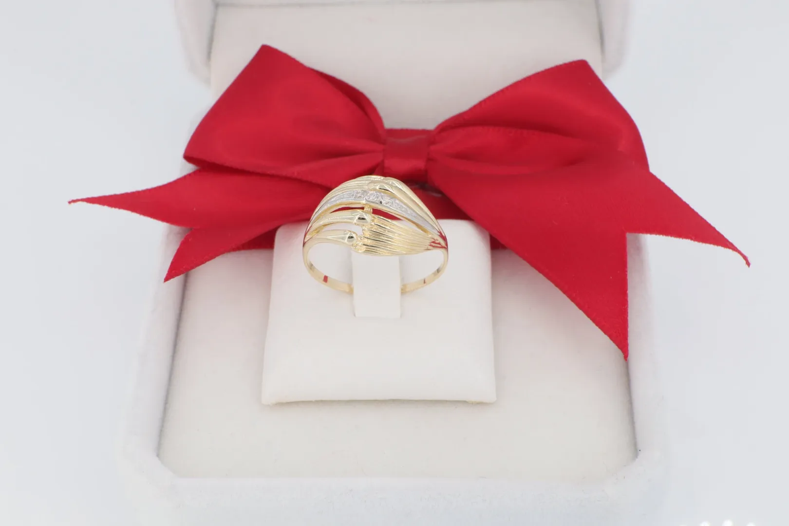 14 Karátos Kéttónusú Gyűrű: Sárga arany és ródiumozott köves sáv dinamikus ötvözete.