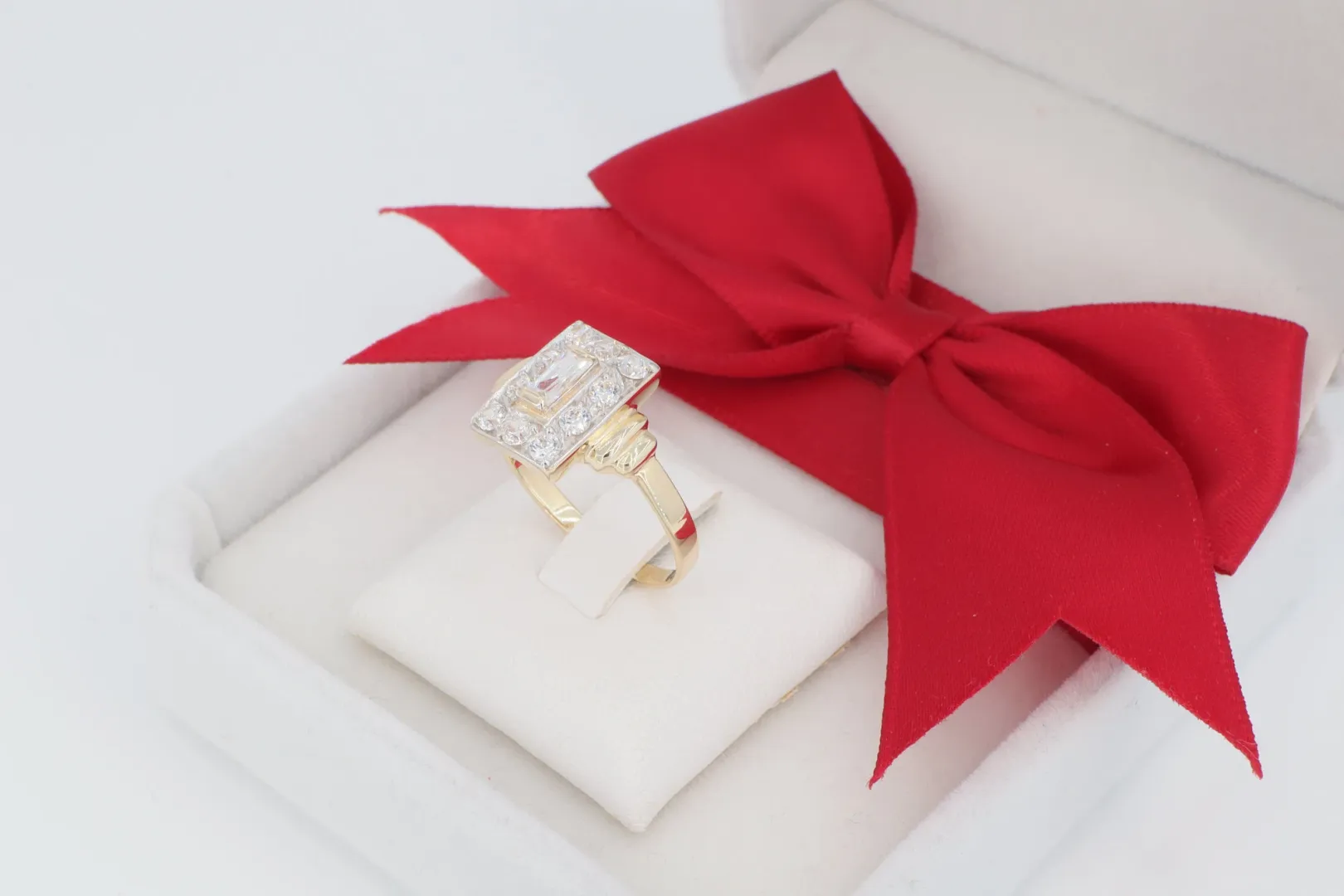 Téglalap/Art Deco Fej: A gyűrű feje geometrikus, téglalap alakú, amely a vintage Art Deco ékszerekre jellemző letisztult, de látványos formavilágot képviseli.
