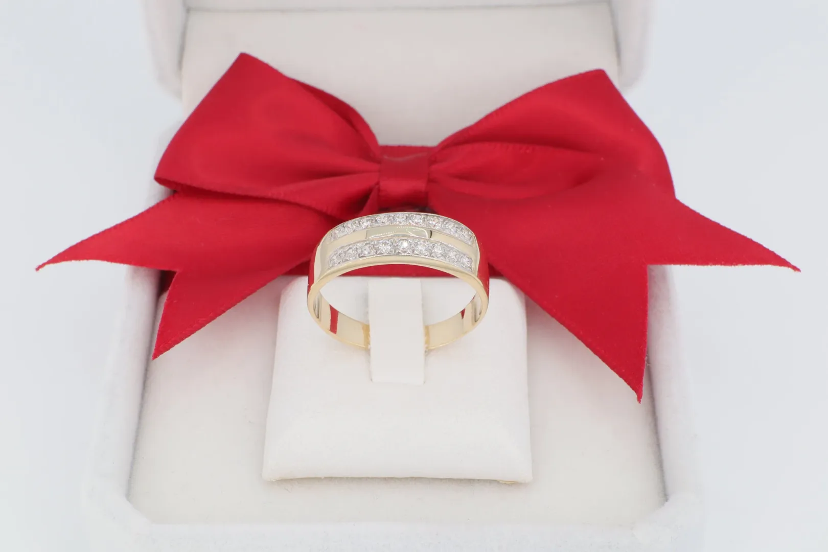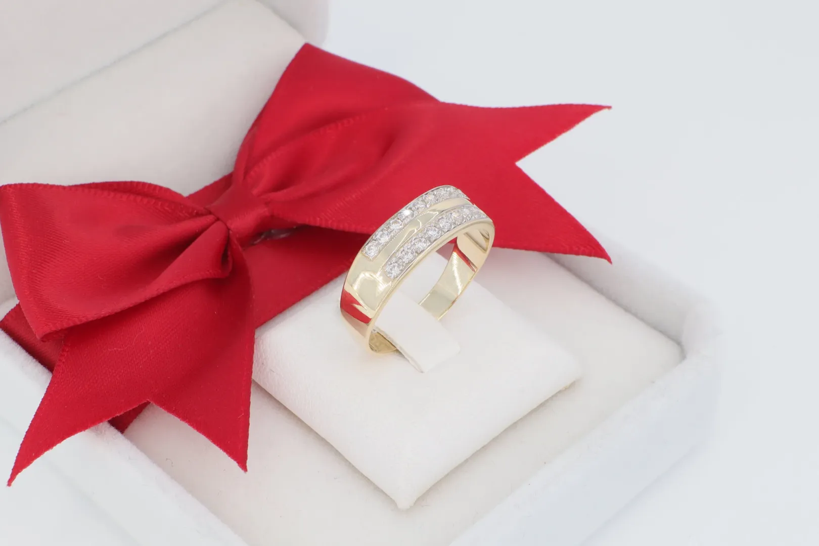 Díszítés: Cirkónia Sávos Gyűrű – A sín középső részén két párhuzamos sorban apró, ragyogó cirkónia kövek helyezkednek el, amelyek egyenletes, intenzív csillogást biztosítanak.
