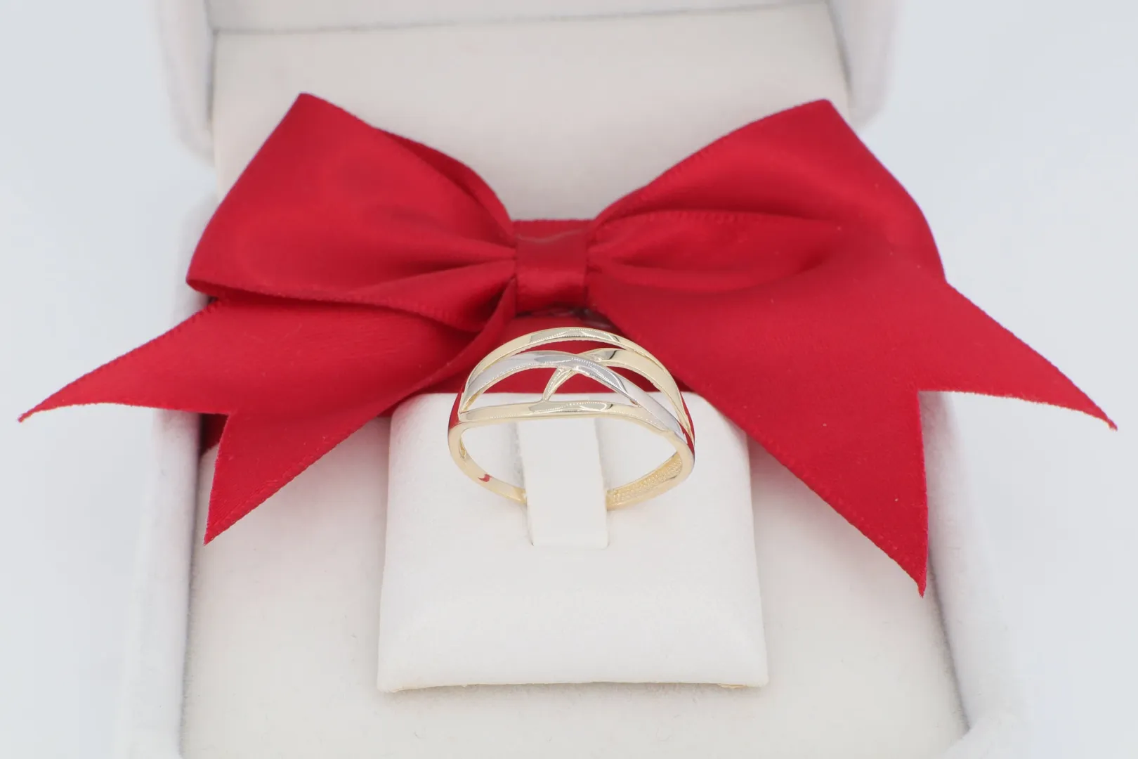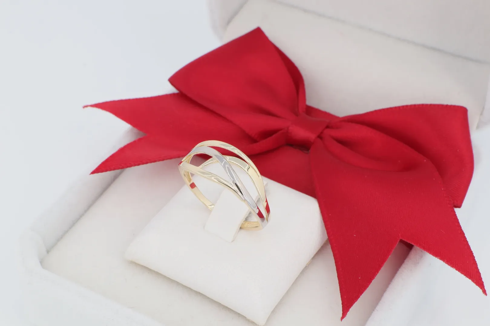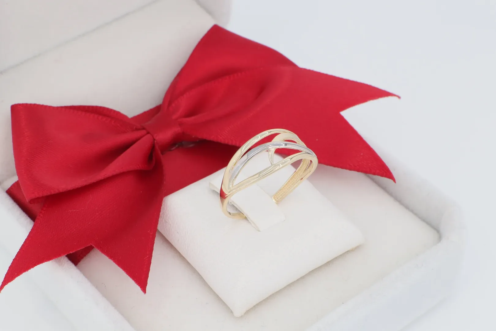 Kétszínű Kereszteződés: A gyűrű feje több, vékony, ívelt szalagból áll, amelyek elegánsan kereszteződnek egymással. A sárga és a fehér arany váltakozása látványos, de finom kontrasztot teremt.