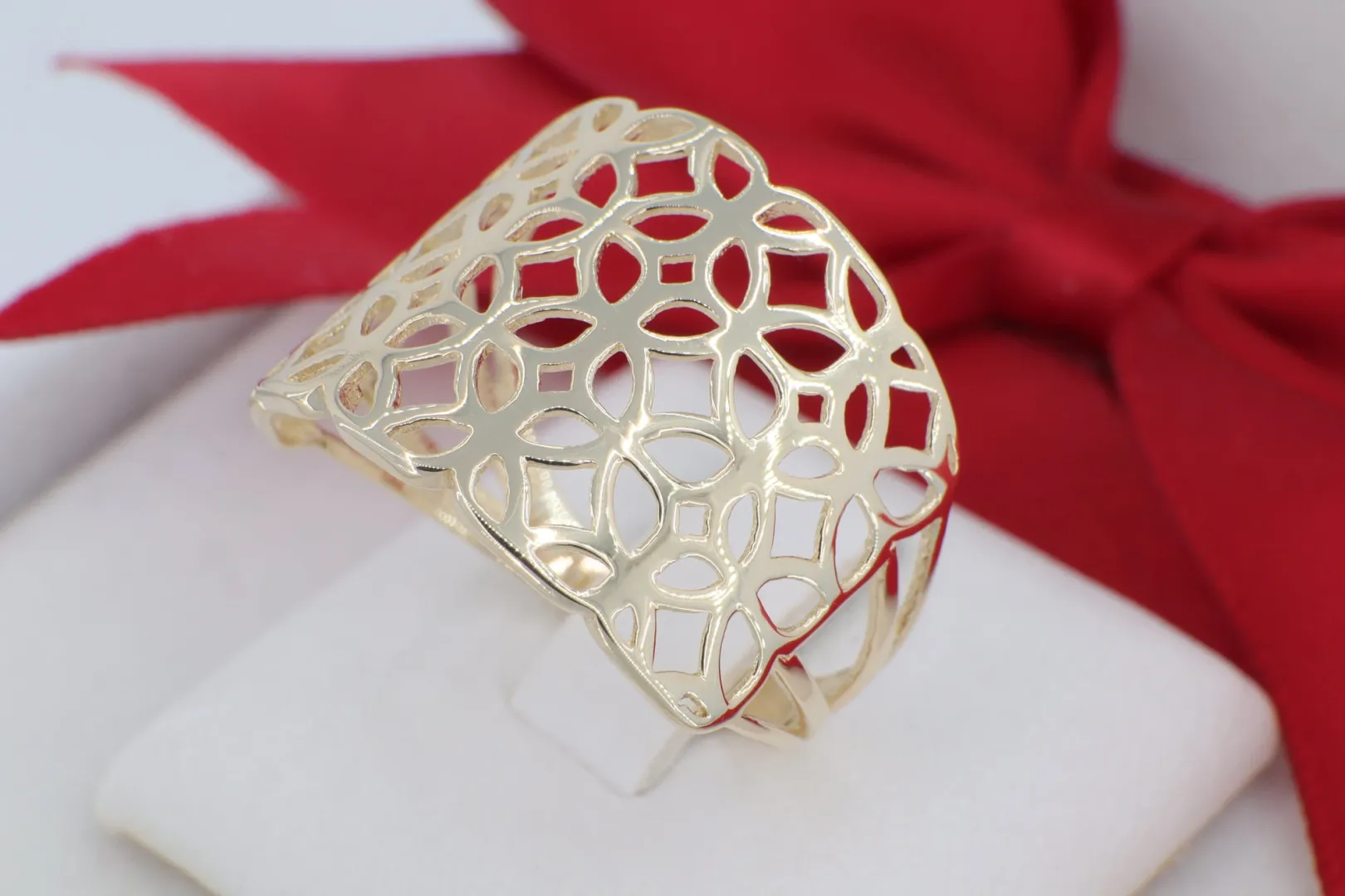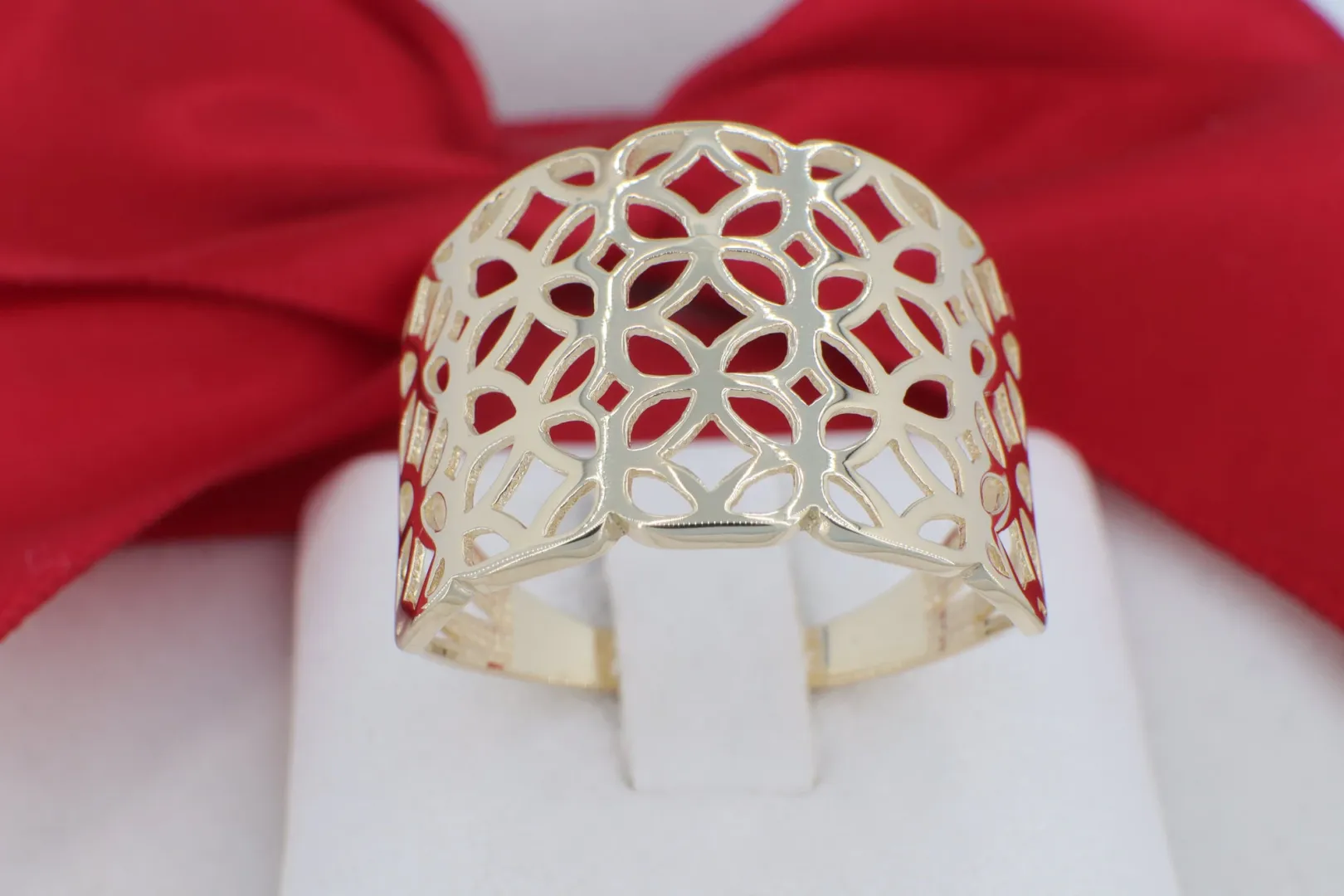 A GY1981-es modellszámú, 14 karátos arany gyűrű a finom kézműves megmunkálás és a modern esztétika ötvözete. Az ékszer fejrészét egy szélesebb, de áttört szerkezet határozza meg, amely kecsesen íveli át az ujjat. A mintázatot precízen kivágott geometrikus rések és polírozott arany felületek alkotják, amelyek együttesen egyfajta „arany csipke” hatást keltenek. Mivel az ékszer nem tartalmaz köveket, a hangsúly teljesen az arany természetes melegségére és a formai bravúrra helyeződik.