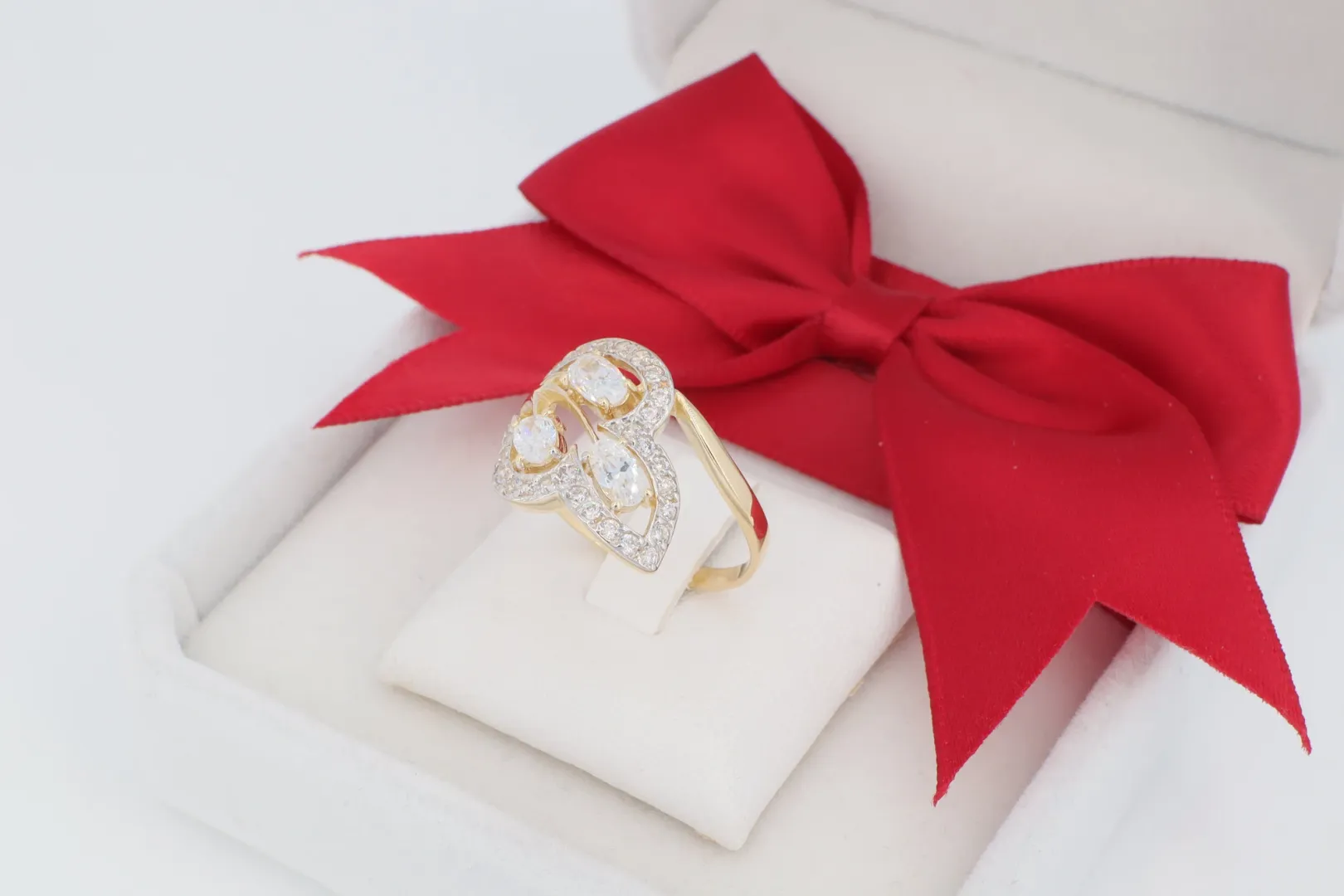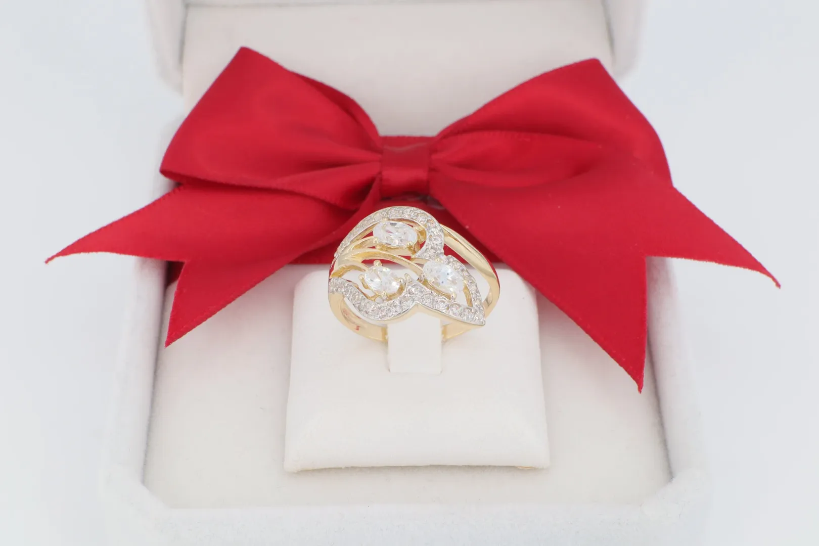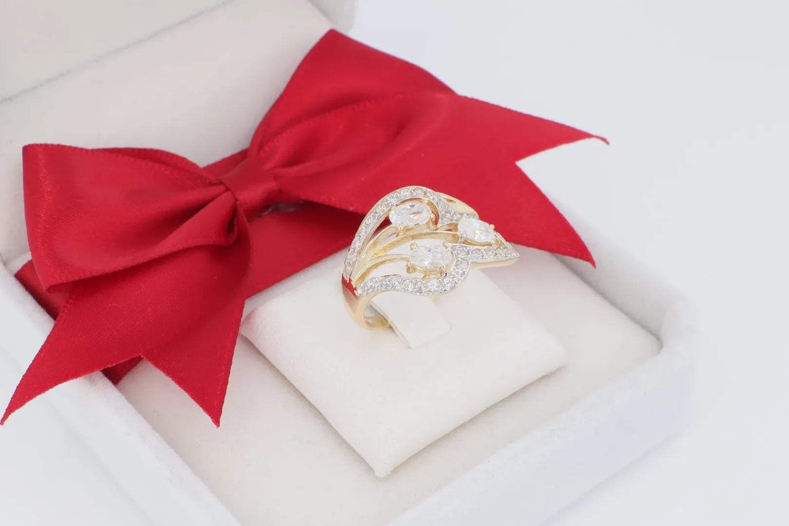 A gyűrű központi fókuszában három nagyméretű, mandula csiszolású cirkónia kő helyezkedik el, amelyek a gyűrűn áthaladó ívelt arany sávok között ülnek. Ezt a hármas, intenzív ragyogást kiegészíti a gyűrűt keretező vékony sávok mentén futó apró pavé cirkónia kövek sora. A kövek foglalata fehérarany hatású (ródiumozott) felületen ül, mely élénk kontrasztot képez a polírozott sárga arany sínnel.
