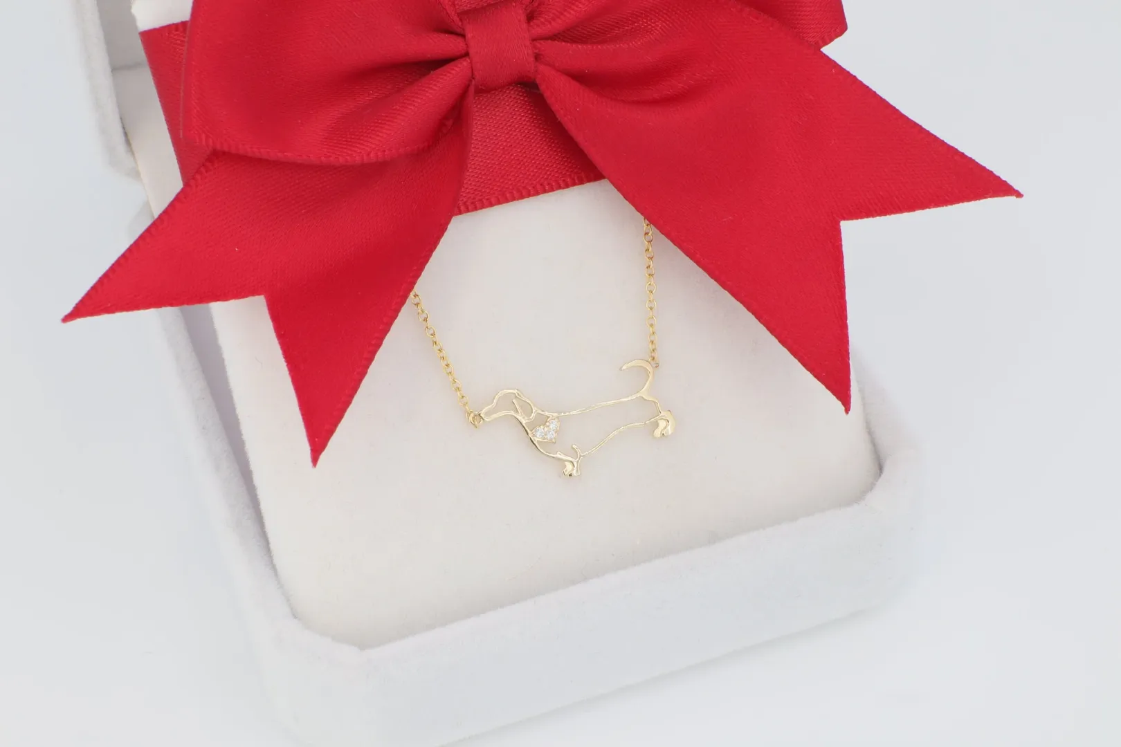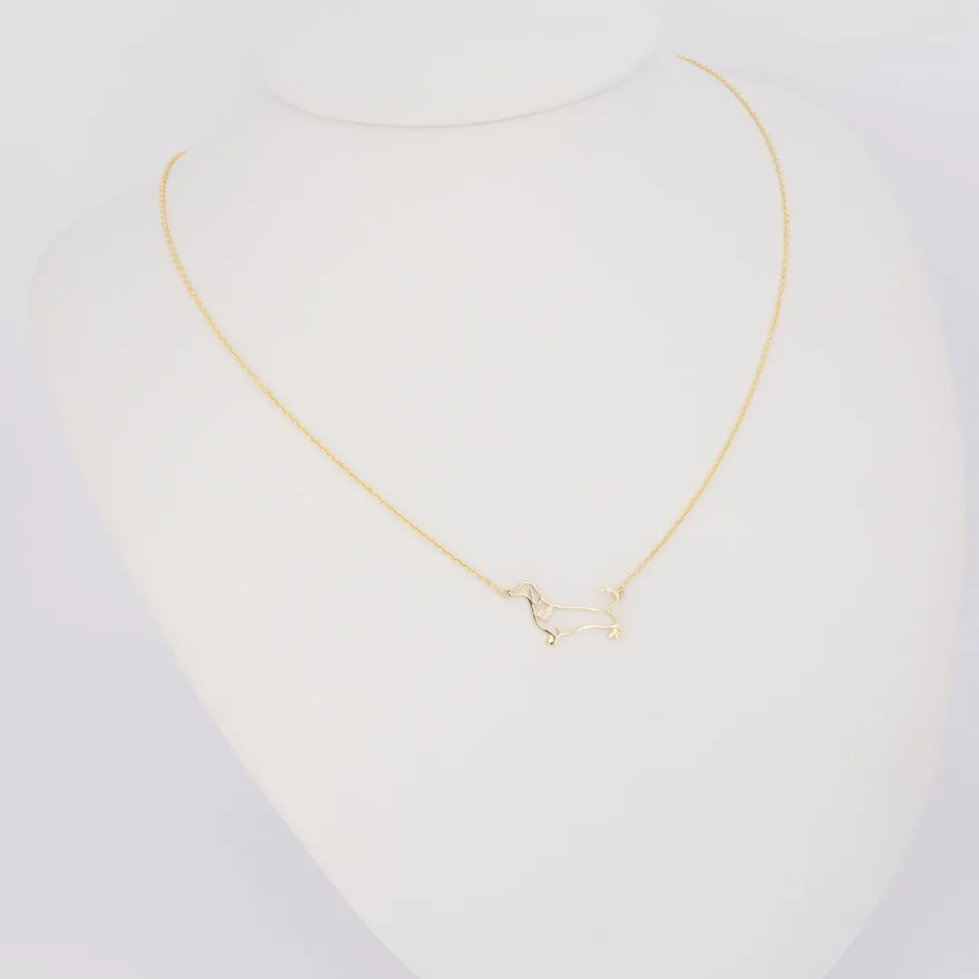Ez a 14 karátos arany nyaklánc a kutyabarátok és a minimalista stílus kedvelőinek tökéletes ékszere. A medál egy stilárisan megrajzolt tacskó (dachsund) sziluettjét formázza, melynek finom, letisztult vonalvezetése modern és elegáns megjelenést biztosít. A sziluett közepét három apró, de annál ragyogóbb cirkónia kő díszíti, amely egy csipetnyi szikrázó csillogást kölcsönöz a darabnak. Ez az ékszer ideális azok számára, akik a kedvenc kutyájuk iránti szeretetüket szeretnék finom, diszkrét és divatos formában kifejezni.