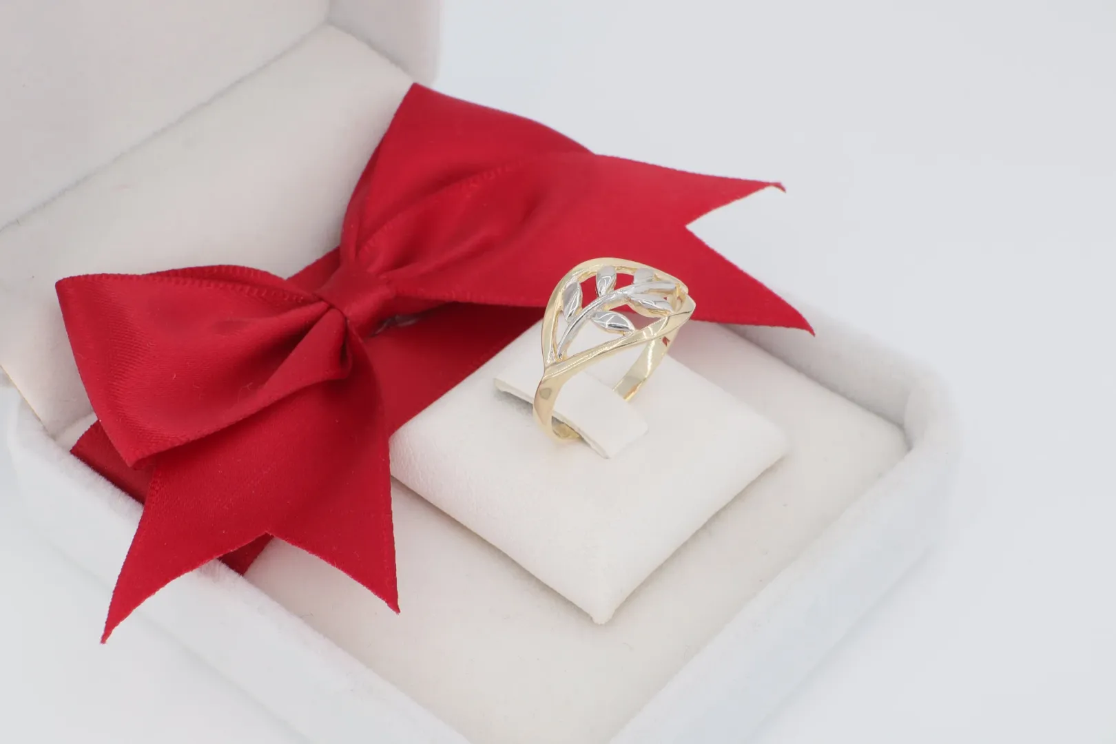 A kiemelt sávok fehér arany hatásúak (ródiumozottak), a másik oldalon lévő áttört levélforma pedig csiszolt, letisztult felületet kapott.