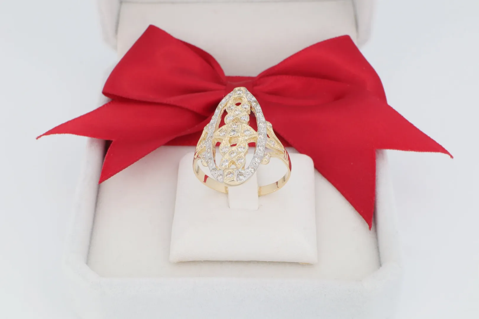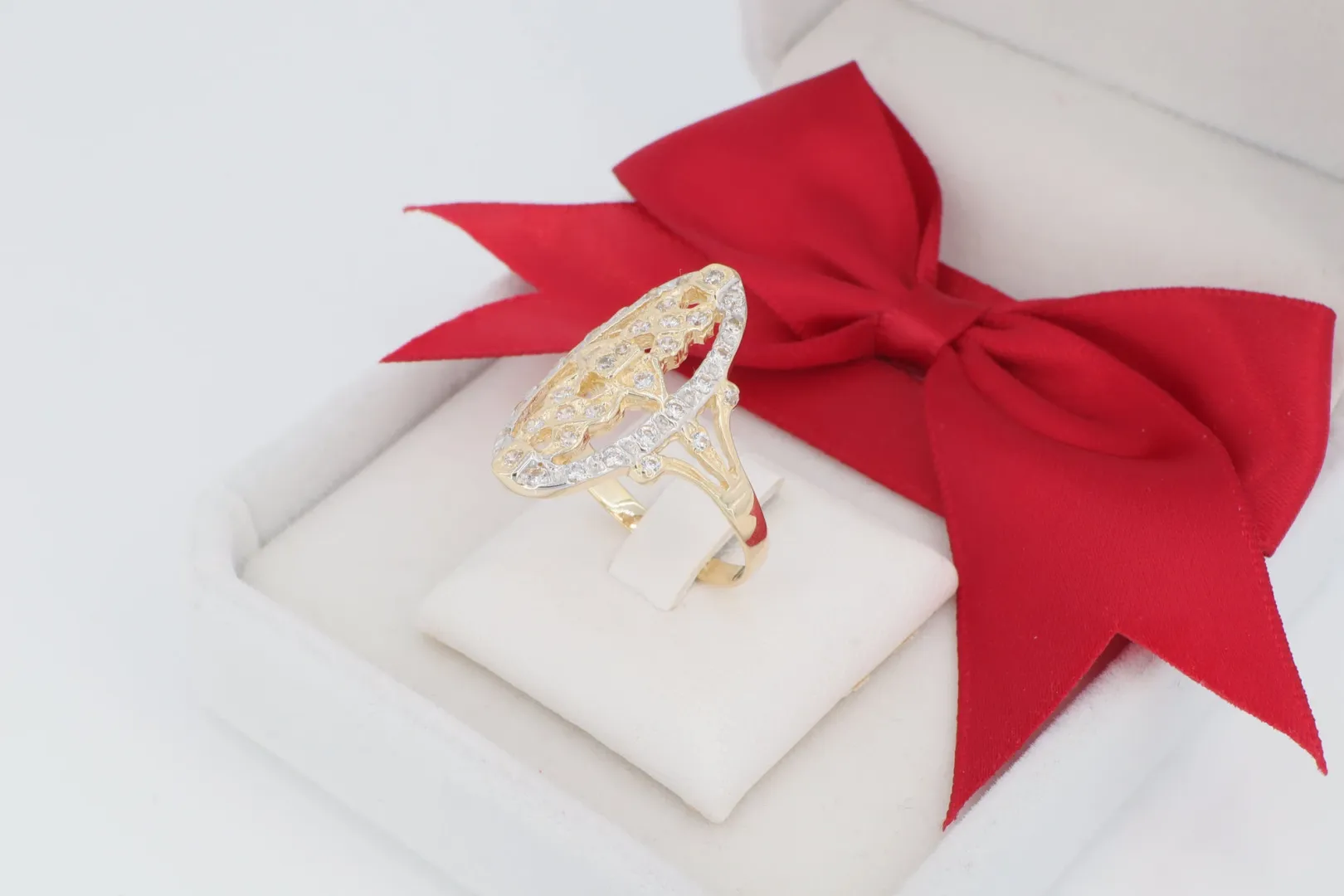 Az ékszer anyaga hitelesített 14 karátos sárga arany (585‰ finomságú), melynek bonyolult mintázata kiemeli az ékszer egyediségét. A gyűrűfej nagy felületét csillogó cirkónia kövek díszítik, melyek ródiumozott (fehér arany hatású) sávokban helyezkednek el a maximális kontraszt érdekében.