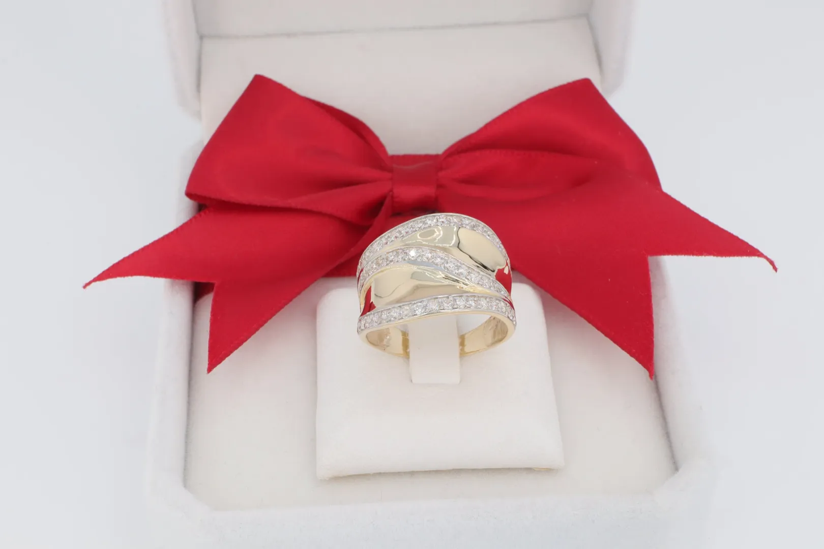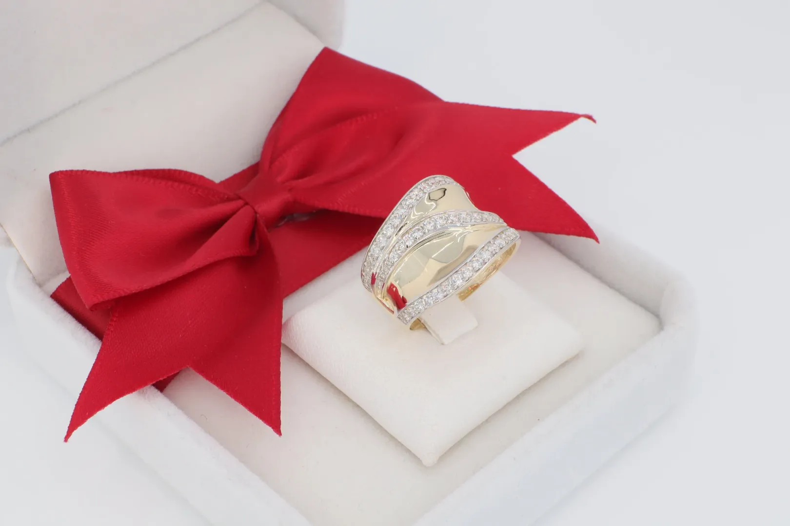 Díszítés: Részleges Cirkónia Berakás – A három sáv közül legalább egy sávot apró, briliáns csiszolású cirkónia kövek díszítenek a gyűrű ívének felső részén. A többi sáv sima, magasan polírozott arany, ami kiemeli a hullámzó mintát.