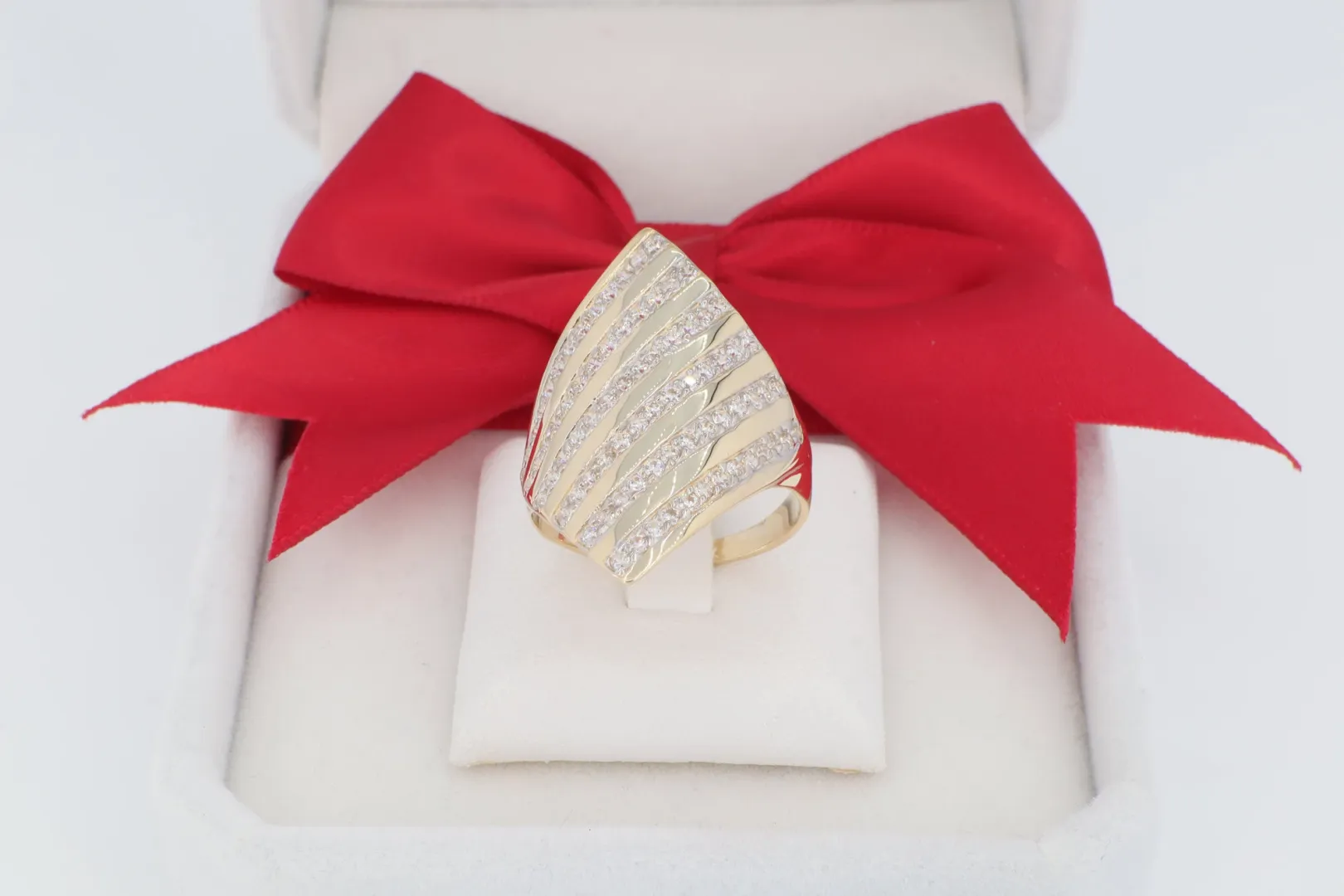 A GY0614 női arany gyűrű egy igazi statement darab, amely az exkluzív megjelenést kedvelő hölgyek számára készült. A gyűrű feje egy látványos, megnyújtott, marquise-szerű (csónak alakú) formát ölt, mely optikailag nyújtja az ujjat. A felületet a klasszikus sárga arany és a szikrázó cirkónia kövek váltakozó, párhuzamos sávjai tagolják. Ez a feltűnő nagy méretű arany gyűrű tökéletes egyensúlyt teremt a klasszikus alapanyag és a modern, dinamikus vonalvezetés között, így ideális választás különleges eseményekre és a mindennapok luxusához.