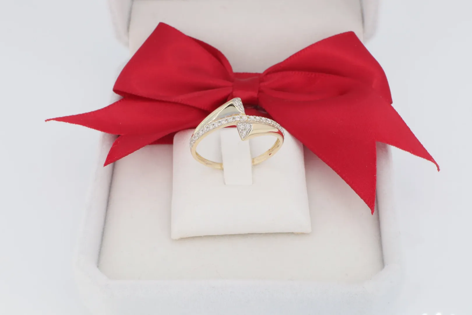 Ez az egyedi arany gyűrű kiválóan illeszkedik a mindennapi, irodai viselethez, de elegendő csillogást ad ahhoz is, hogy egy elegáns vacsora vagy egy különleges rendezvény központi ékszerévé váljon. Keresztbe futó formája optikailag nyújtja az ujjakat, ezzel is fokozva a kéz eleganciáját. Ideális ajándék modern nőknek.