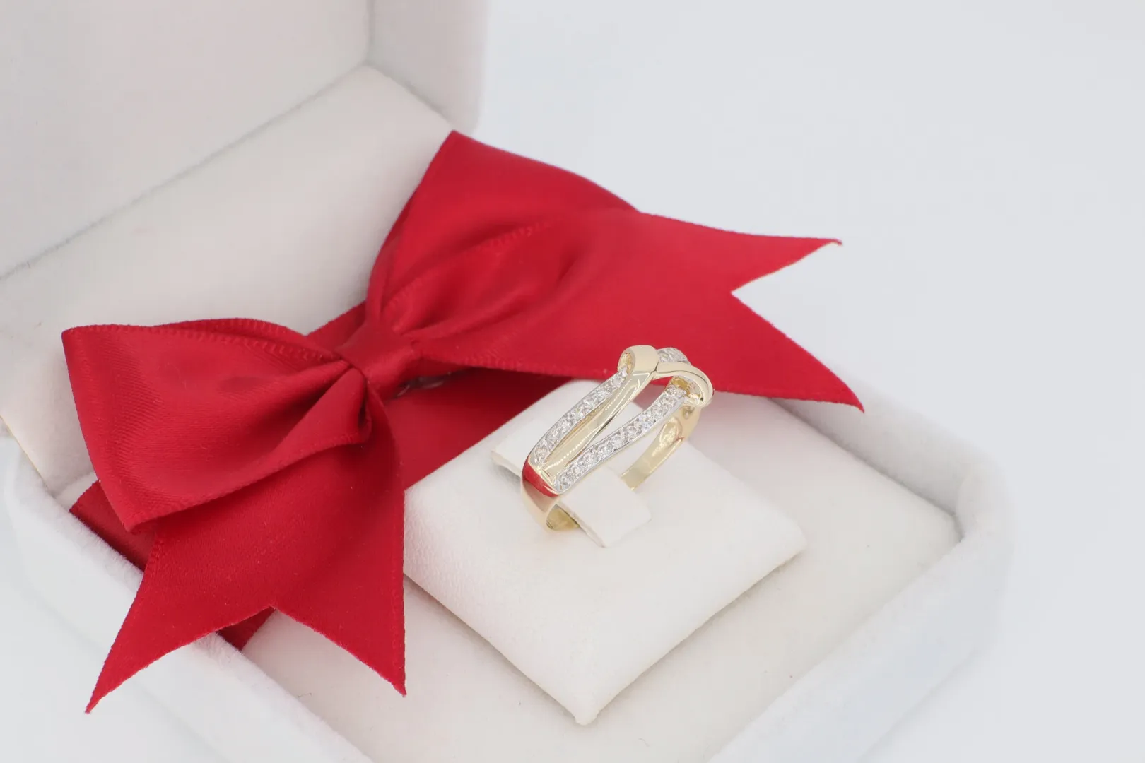 A GY0744 14 karátos arany gyűrű a modern ékszertervezés kiváló példája, ahol az egyszerű formák találkoznak a ragyogó részletekkel. A design alapját két ívelt sáv adja, melyek kecsesen keresztezik egymást, egyfajta elegáns, örök csomót szimbolizálva.