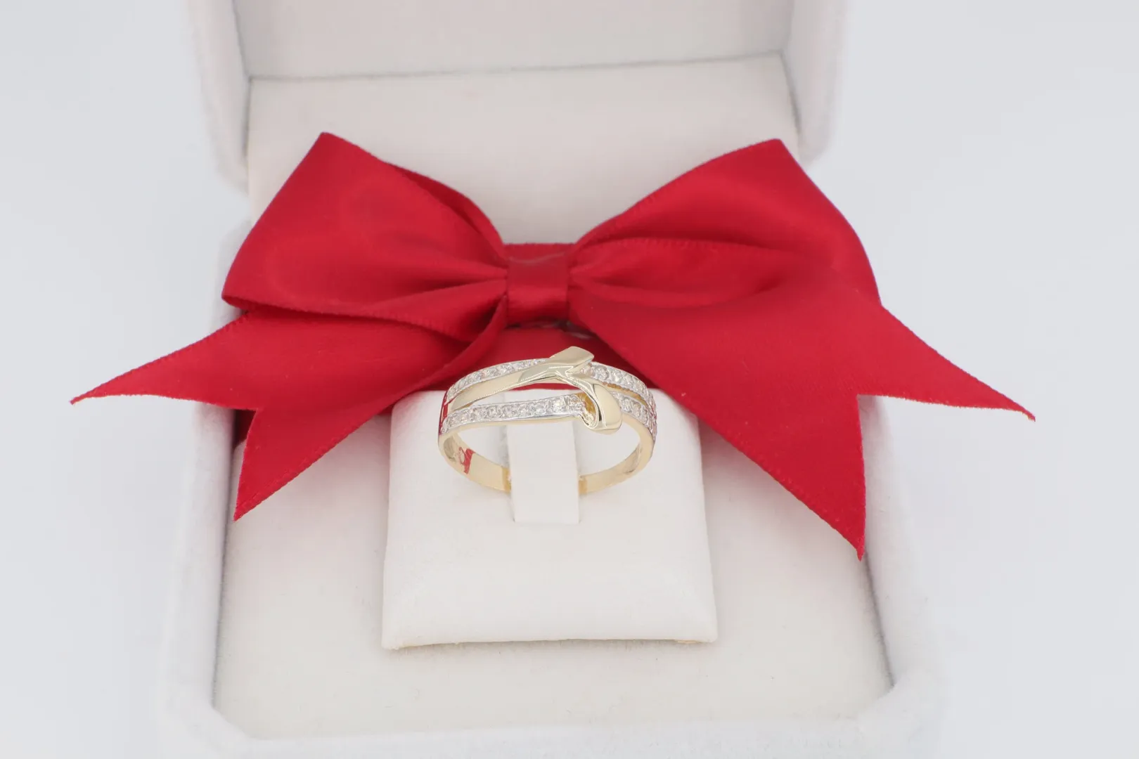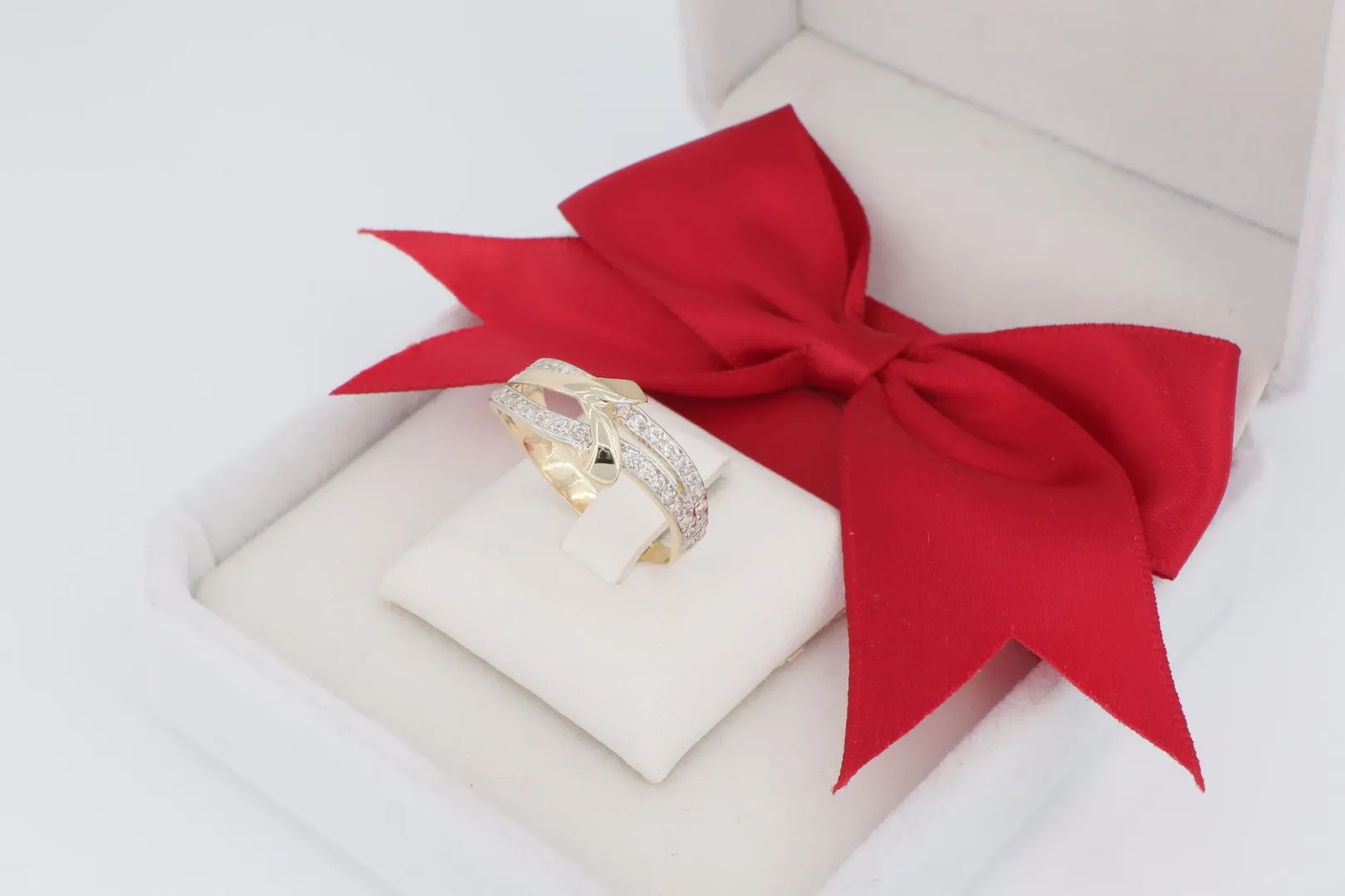 Kétsávos, Fonott Dizájn: A gyűrű feje két sávból épül fel, amelyek a gyűrű tetején egy finom csomóvá fonódnak össze, ami a szeretet és az összetartozás örök jelképe.