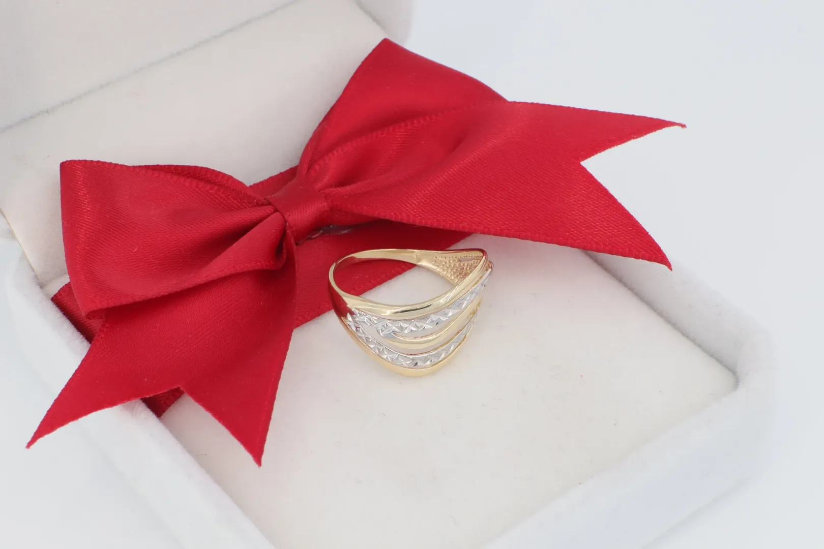 Ez a lenyűgöző 14 karátos arany gyűrű a fém erejét és finom megmunkálását mutatja be. Teljesen kő nélküli, a ragyogást a hullámzó formák, a kéttónusú kivitel és a felületi textúrák kontrasztja biztosítja.