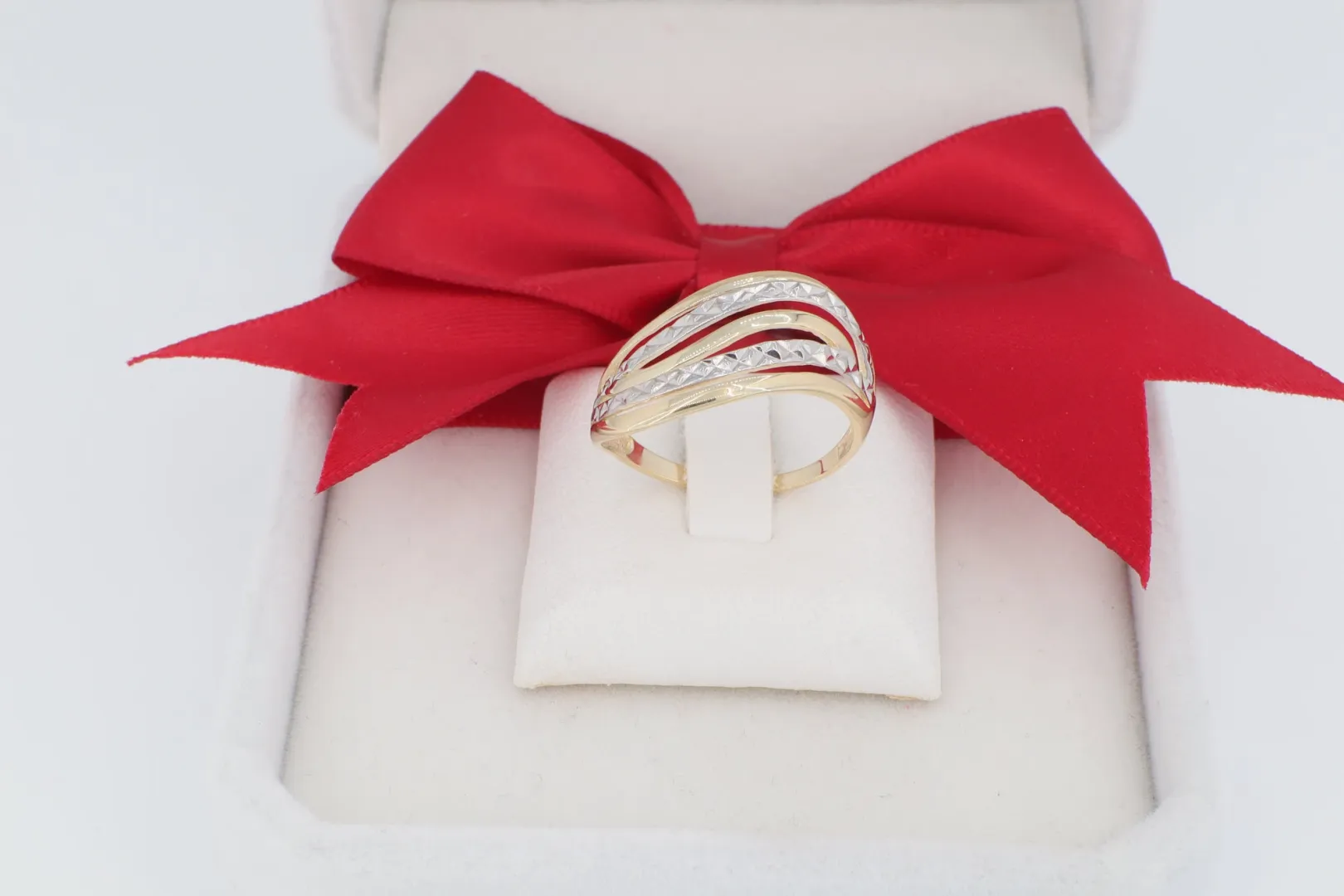 Ez a modern arany gyűrű ideális választás azoknak, akik a látványos, mégis praktikus és kő nélküli ékszereket kedvelik, amelyek a kéttónusú kivitel miatt könnyen kombinálhatók.