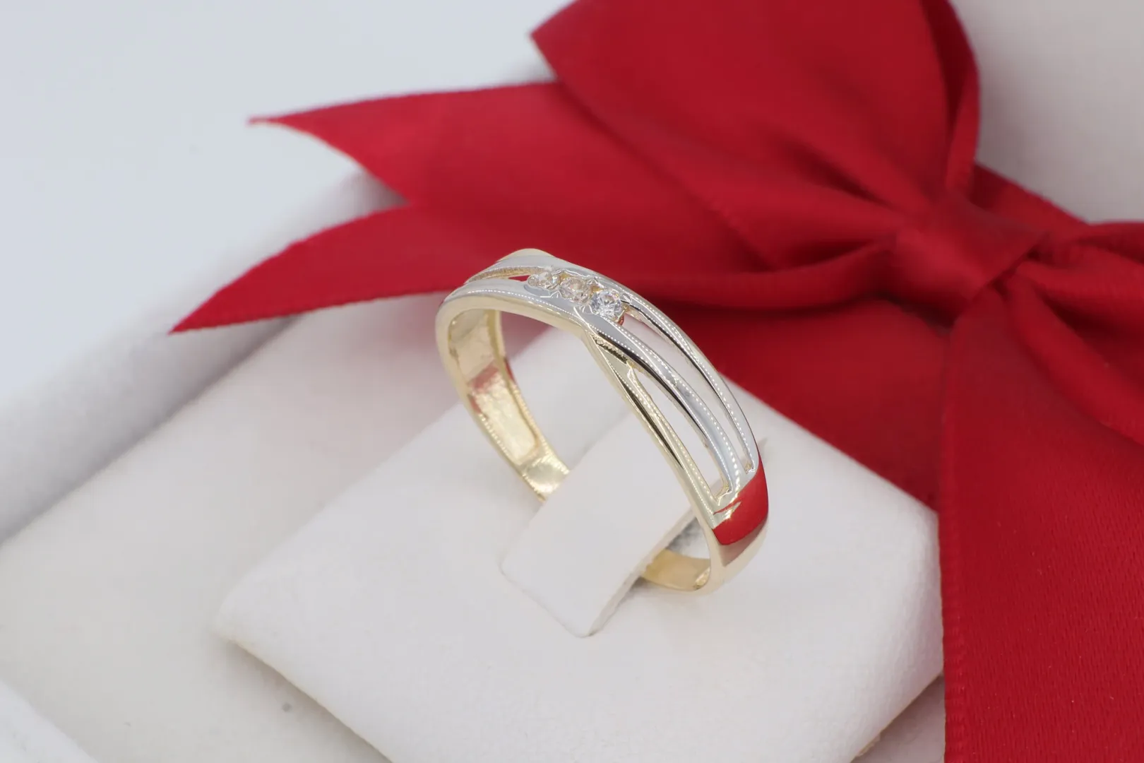 Fehér Arany Hatású Ródiumozás: A ródium bevonatú részek és a sárga arany váltakozása izgalmas, kéttónusú összhatást eredményez.