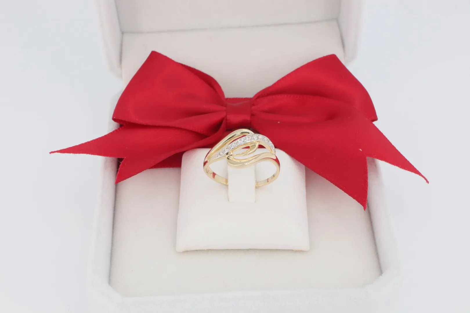 A gyűrű igazi különlegessége a sávok kontrasztos felületkezelésében rejlik: a két szélső sáv fényesre polírozott sárga arany, míg a középső, íves sávot ragyogó cirkónia kövek díszítik. Ez a rétegelt hullámforma feltűnő, mégis kifinomult megjelenést biztosít.
