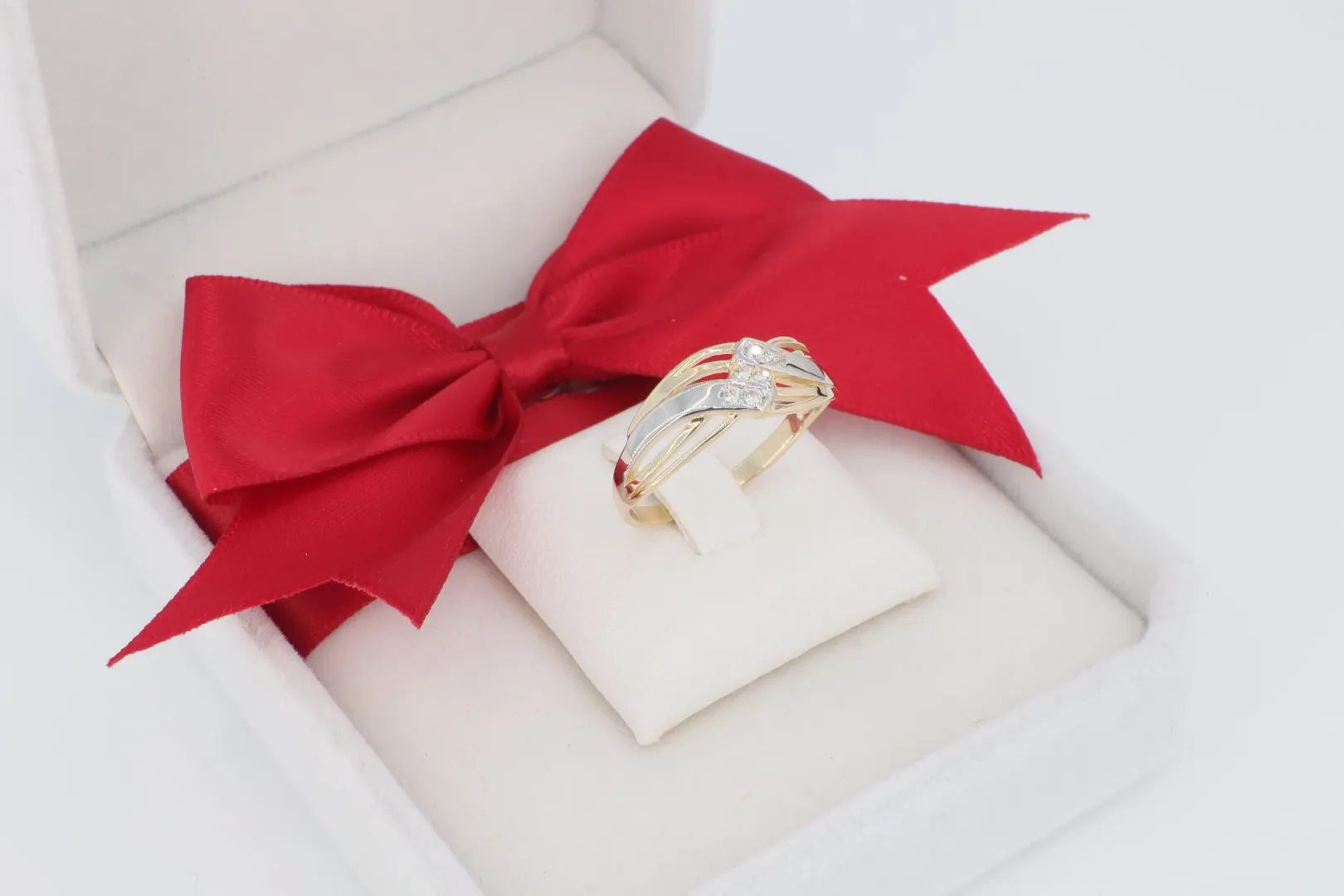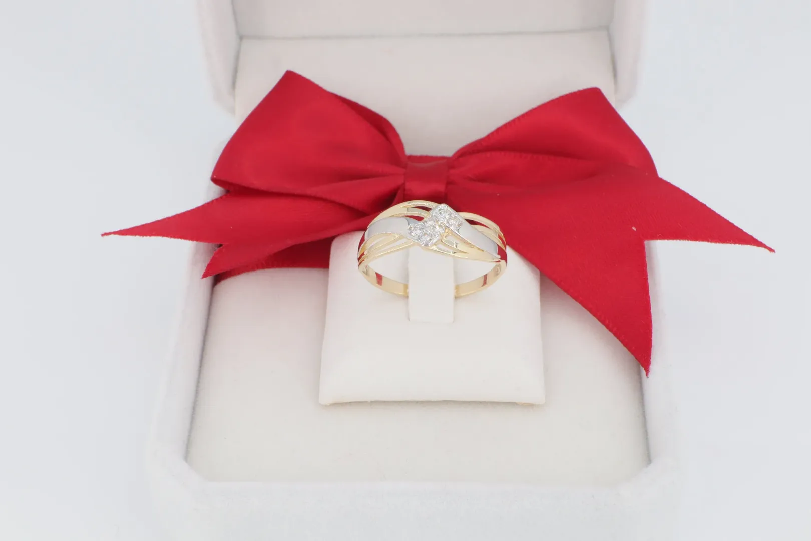 A gyűrűsín tetejét három, párhuzamosan futó sáv alkotja, amelyek a gyűrű fejénél egymást keresztező hullámvonalat formáznak. A középső sáv fehér arany hatású (ródiumozott), és apró, ragyogó cirkónia kövekkel van díszítve, ami látványos vizuális elkülönülést hoz létre a két szélső sárga arany sávtól.