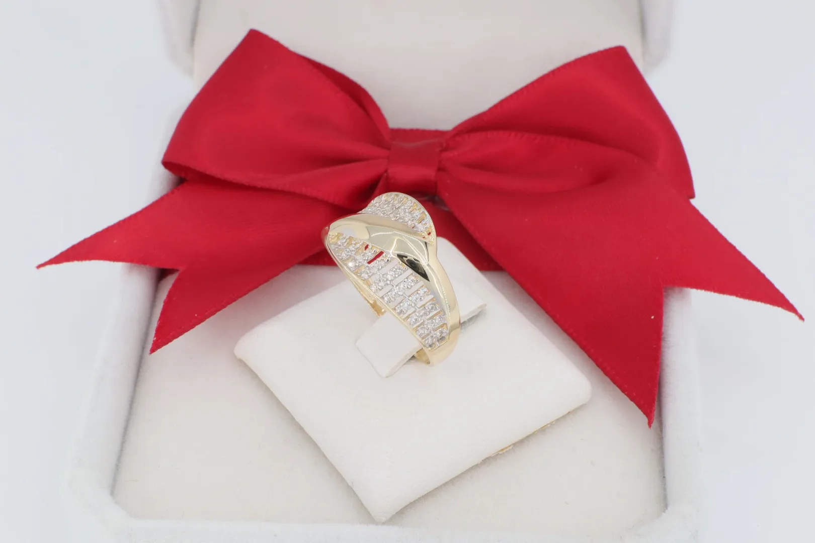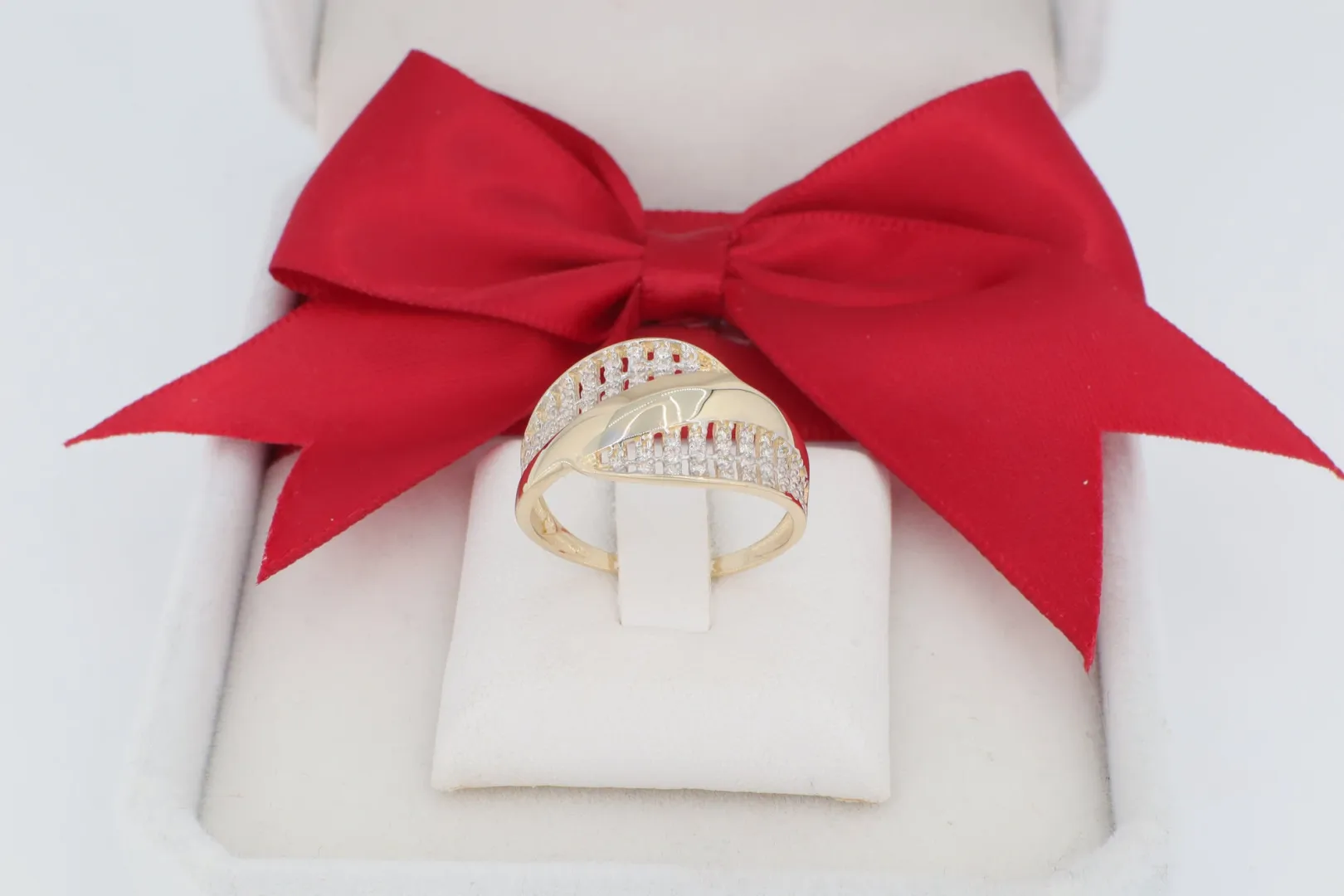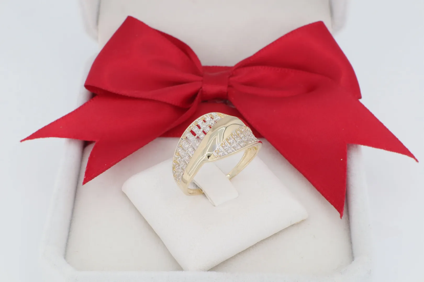 A gy1525-ös Női Széles Arany Gyűrű (14 karátos) a modern luxus és a merész elegancia ikonikus darabja. A gyűrű feje rendkívül széles, domború kialakítású, melyet átlósan futó, párhuzamos sávok osztanak fel. Két hangsúlyos sáv teljes felületét apró, pave (burkolat) foglalatos cirkónia kövek borítják, melyek intenzív és összefüggő csillogást biztosítanak. A kövezett sávokat sima, magasan polírozott sárga arany sáv választja el, mely modern, vágott hatást kölcsönöz a designnak. Ez az ékszer egy igazi divatos statement gyűrű azoknak, akik a feltűnő ragyogást részesítik előnyben.