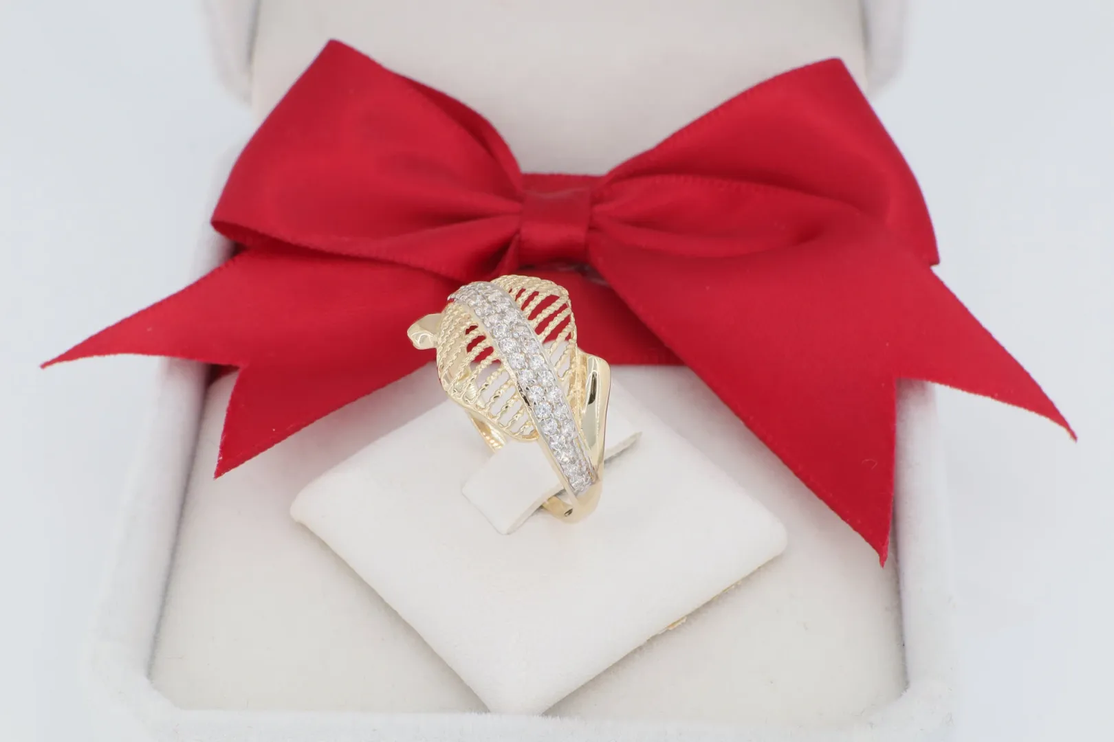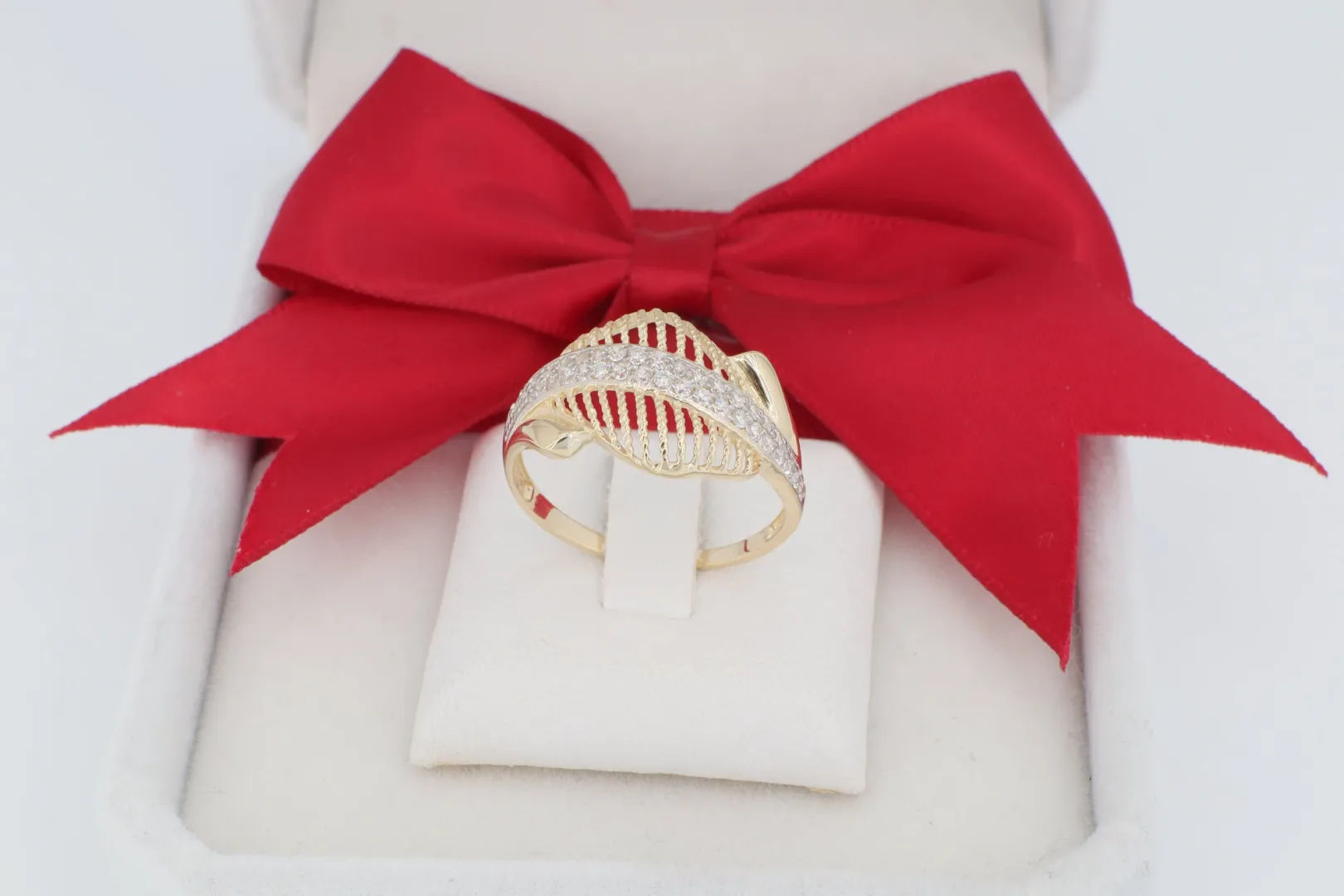A gy1603-as Női Arany Gyűrű (14 karátos) a merész és légies formatervezés kivételes ötvözete. A gyűrű feje egy stilizált, toll motívumra emlékeztető, széles, ívelt design. A tollazatot két sávban futó, pave foglalatos cirkónia kövek alkotják, amelyek között finom, áttört arany szálak biztosítják a légies, pehelykönnyű megjelenést. Az ékszer modern, organikus formája és a kövek intenzív csillogása egy valódi statement ékszert eredményez, amely a szabadságot és a finom eleganciát szimbolizálja.