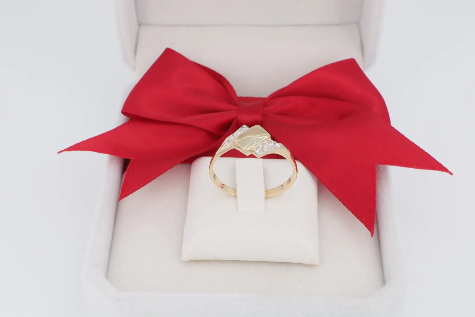 A gyűrű anyaga hitelesített 14 karátos sárga arany (585‰ finomságú), melynek gazdag színe kiemeli az ékszer letisztult formáit. A fejet két fő elem alkotja: egy sima, polírozott, négyszögletes arany lap, és egy ívesen elhelyezett, csillogó cirkónia kövekkel kirakott sáv. Ez a kontraszt adja az ékszer dinamizmusát.