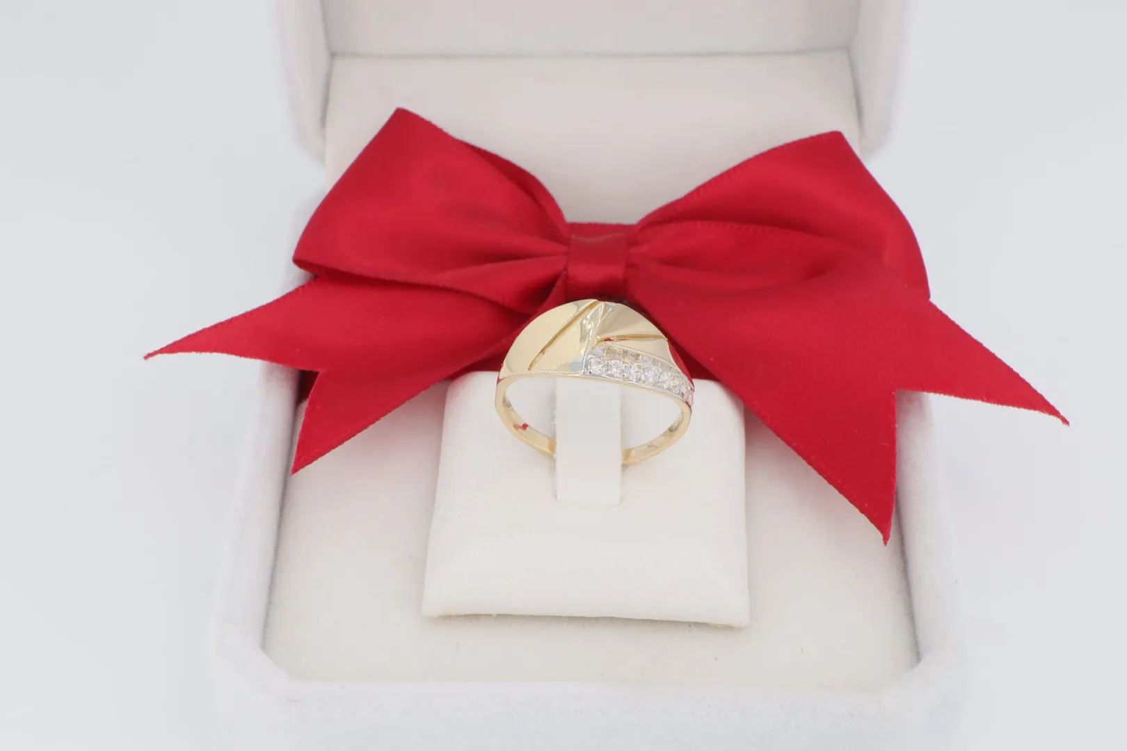 A gyűrű anyaga minőségi 14 karátos sárga arany (585‰ finomságú), ami garantálja az értékállóságot és a tartósságot. A gyűrű feje lapos, szögletes felülettel rendelkezik, ami a fény és árnyék játékával kelt futurisztikus hatást. A dizájn egyik fele sima, polírozott arany, míg a másik fele egy íves sávban elhelyezett, ragyogó cirkónia kövekkel van díszítve.