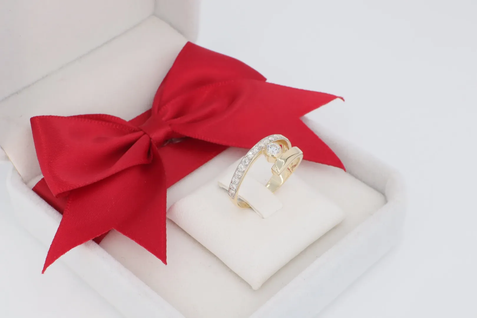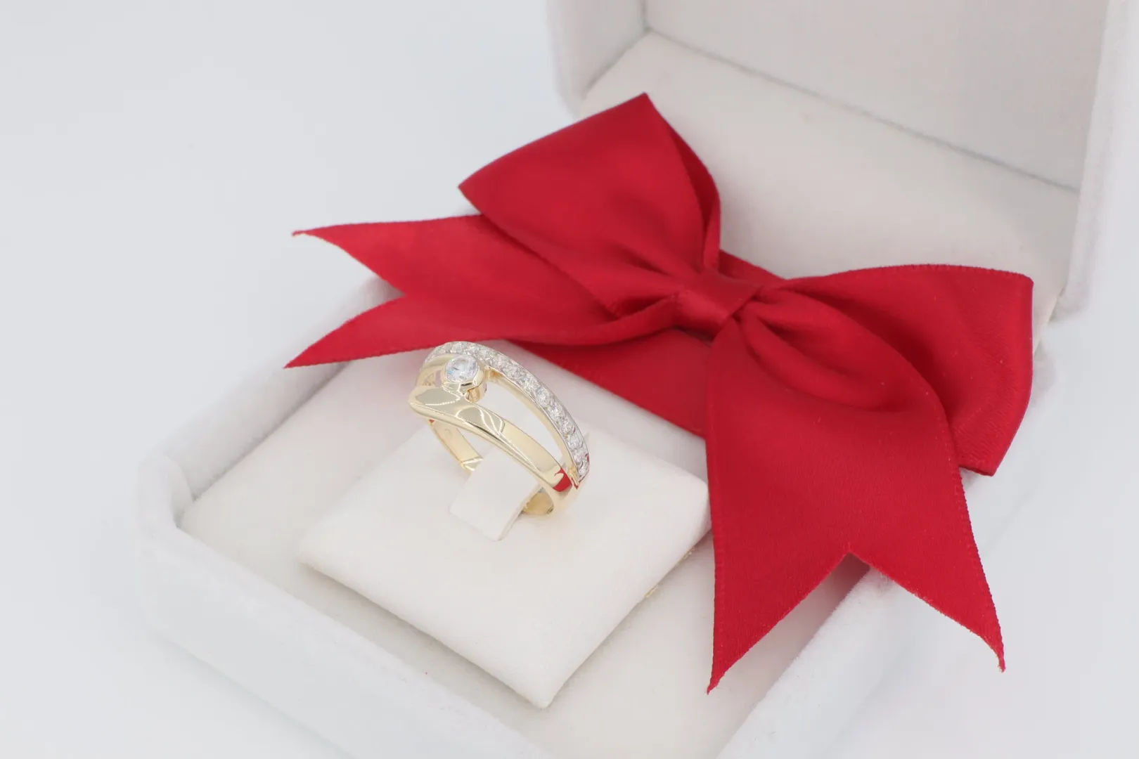 Design: V Alakú, Nyitott Forma – A gyűrűfejet két keskeny sáv alkotja, amelyek ívesen szétválnak, majd a gyűrű tetején lágyan átfedik egymást. Ez a nyitott design optikailag nyújtja az ujjat.