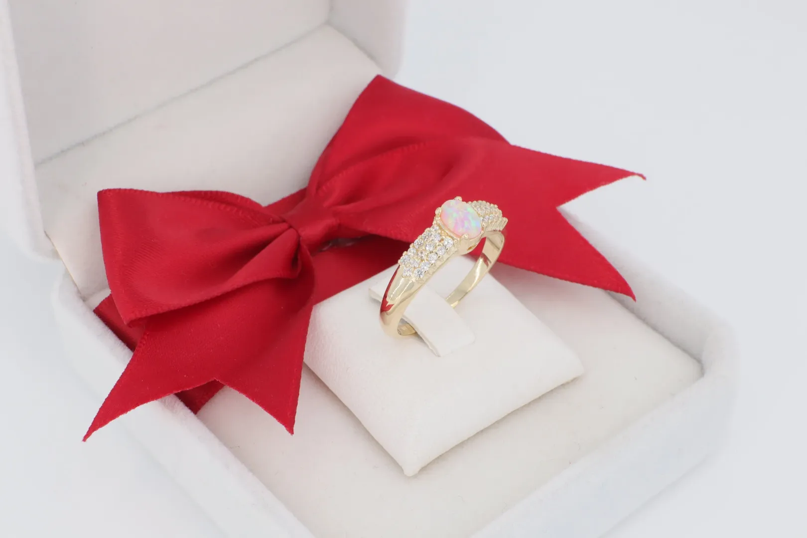 Körbeölelő Cirkóniák: Az ovális opál követ apró, szikrázó fehér cirkónia kövek ölelik körbe, keretbe foglalva és kiemelve a központi kő csillogását.