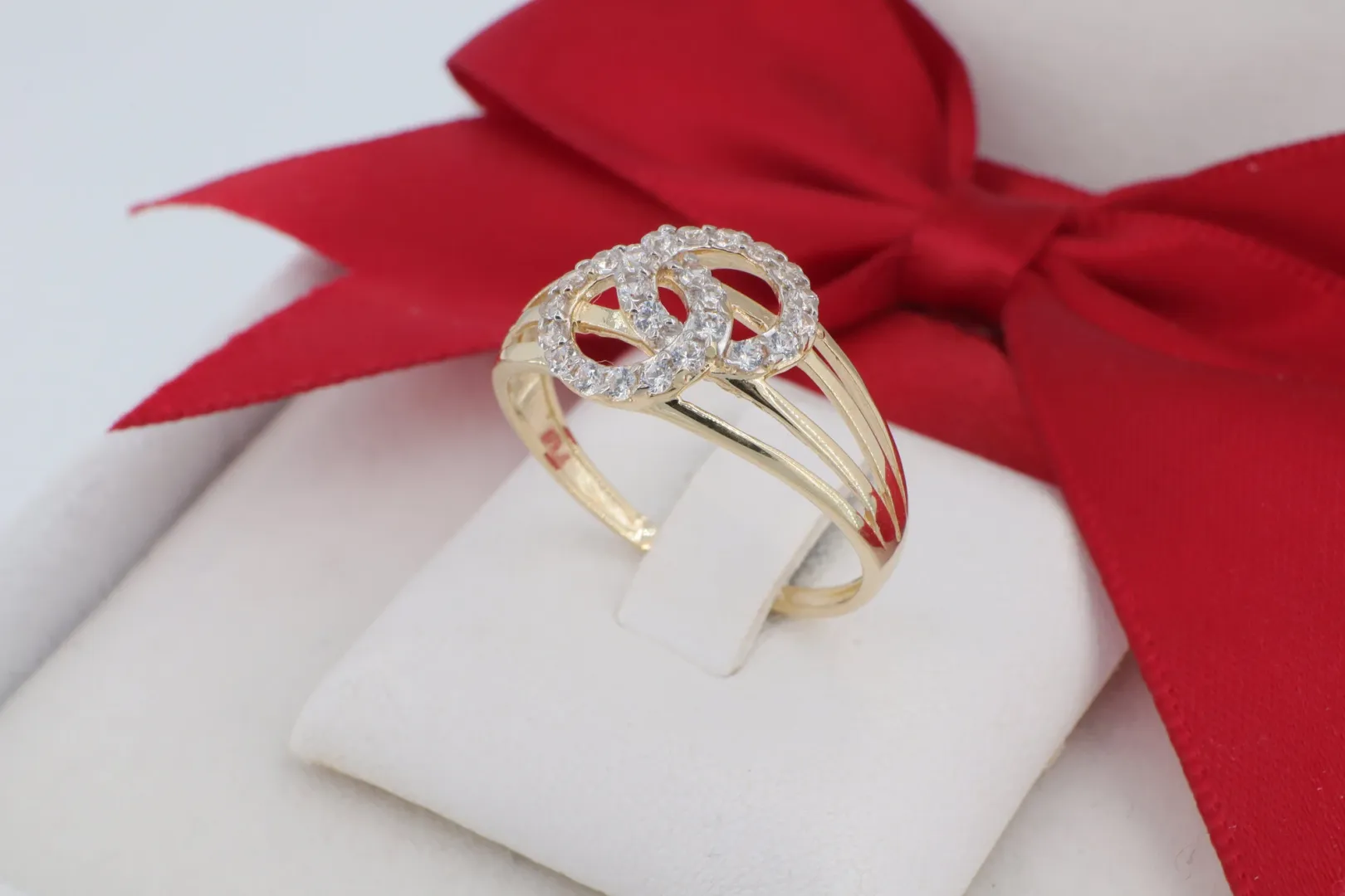 Összefonódó Kör Motívum: A két kör találkozása elegáns és kiegyensúlyozott formát ad a gyűrűnek, amely vonzza a tekintetet.