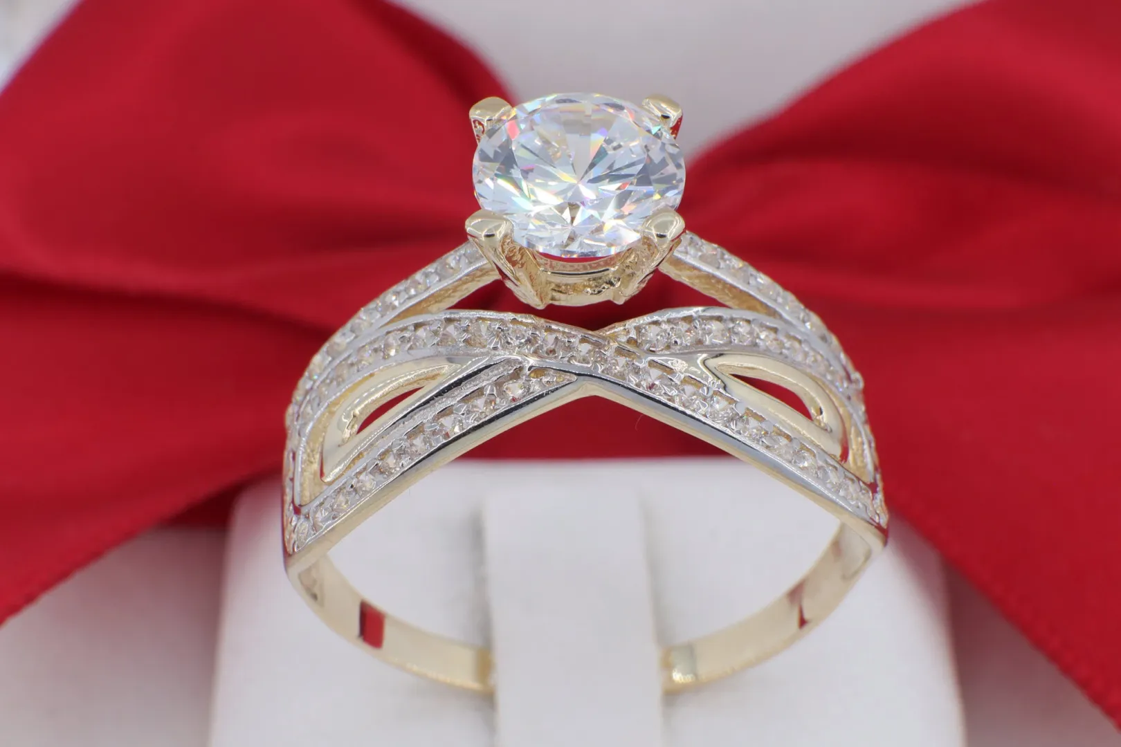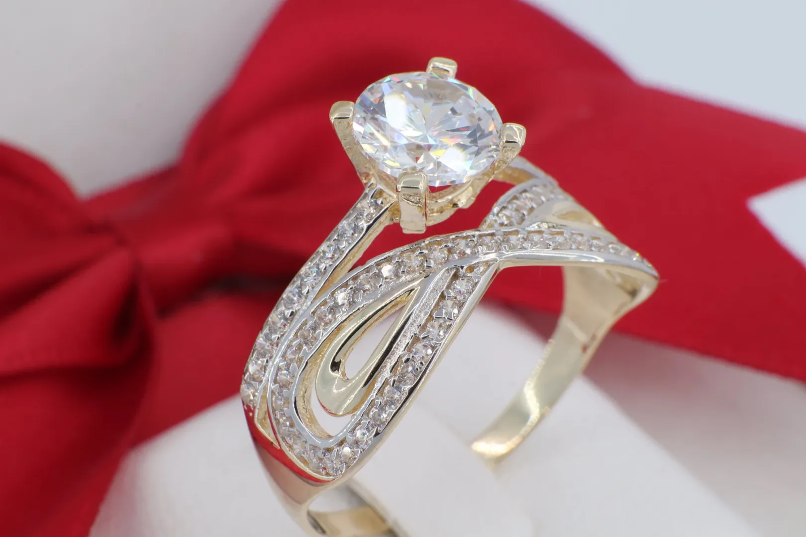 Ez a GY1614-es cikkszámú, 14 karátos arany gyűrű a pazar csillogás és a művészi, összefonódó formák mesterműve. Az ékszer különlegessége az áttört, egymást keresztező sávokból álló fejrész, amely egyfajta végtelen eleganciát sugároz. A gazdagon kövezett ívek felett egy koronaként tündöklő, nagyméretű központi kő foglal helyet, amely minden irányból magába szívja és szikrázóan veri vissza a fényt. Ez az ékszer azoknak készült, akik a klasszikus eljegyzési stílust keresik, de vágynak egy látványosabb, modern és egyedi formavilágra.