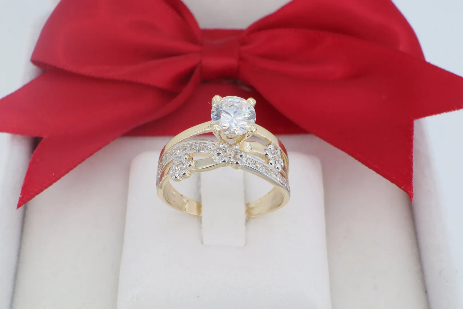 Virágos Inda Díszítés: A gyűrű feje alatt több áramló sáv fonódik össze, melyeket apró, precízen kidolgozott virágmotívumok ékesítenek, romantikus és nőies karaktert adva az ékszernek.