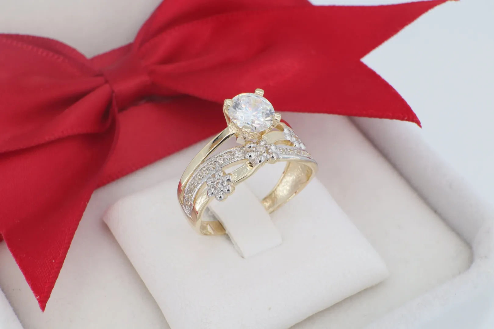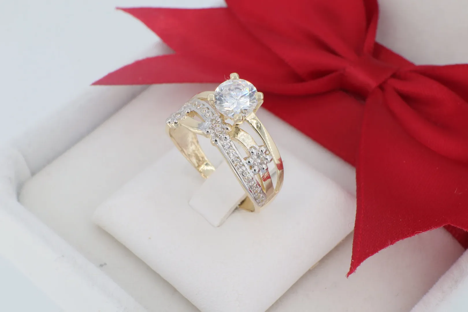 Kétszínű Hatás (Ródiumozás): Az indákon futó kövezett sávok és a virágok fehér arany hatású ródium bevonatot kaptak. Ez a technika felerősíti a beágyazott apró cirkóniák fényét és modern kontrasztot alkot a sárga arany alappal.