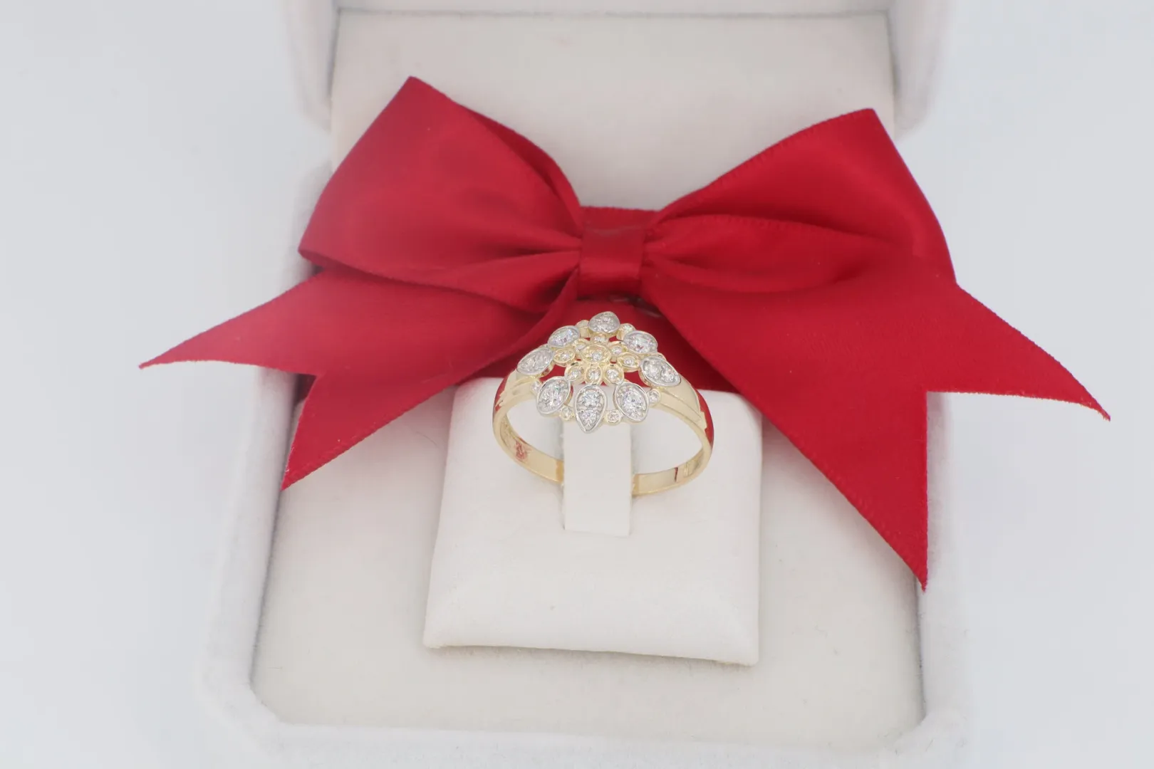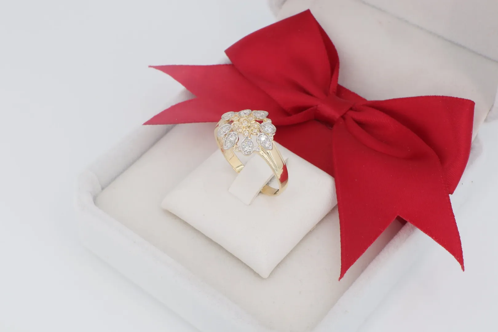 A gy1932-es Női Arany Gyűrű (14 karátos) a romantika és a pompás ragyogás tökéletes kifejezője. A gyűrű feje egy látványos, virágcsokorra emlékeztető motívumot formáz, melyben kisebb és nagyobb, csepp- és kerek csiszolású cirkónia kövek alkotnak finom koszorút. A kövek apró arany szálakkal vannak rögzítve, amely légies, filigrán hatást kölcsönöz a designnak, miközben a kövek maximálisan érvényesülnek. A gyűrű sínjének vállai enyhén szélesednek és bordázottak, elegáns alapot biztosítva a fenséges fejrésznek.