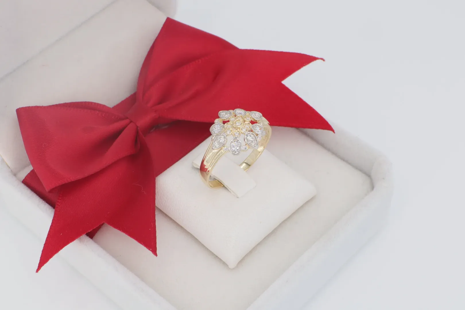 Virágcsokor Motívum: A több, különféle méretű és csiszolású kőből álló design egy pompás virágkoszorút idéz, ideális elegáns, romantikus arany gyűrűt keresőknek.