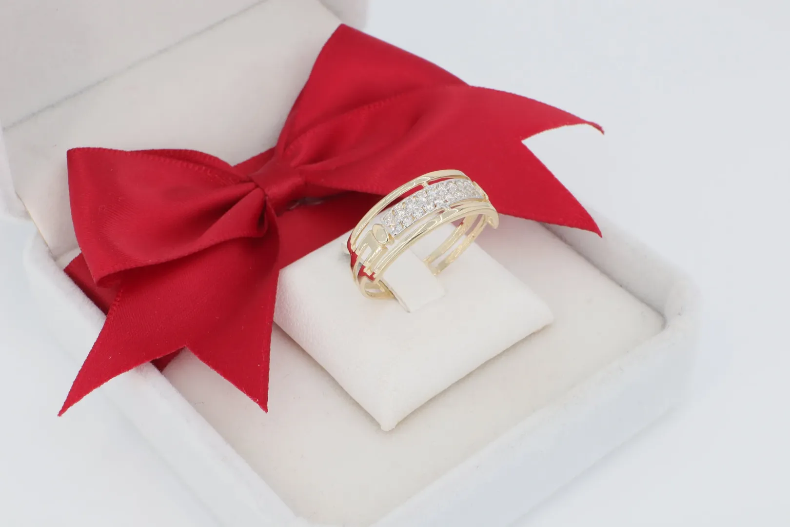 Felületkezelés: Ródiumozott Felület és Kétszínű Hatás – A gyűrű központi sávja, amely a díszítést hordozza, ródiumozott bevonattal készült. Ez az ezüstös-fehér ragyogás hűvös kontrasztot képez a sárga arany kerettel szemben, maximalizálva a kövek fényét.
