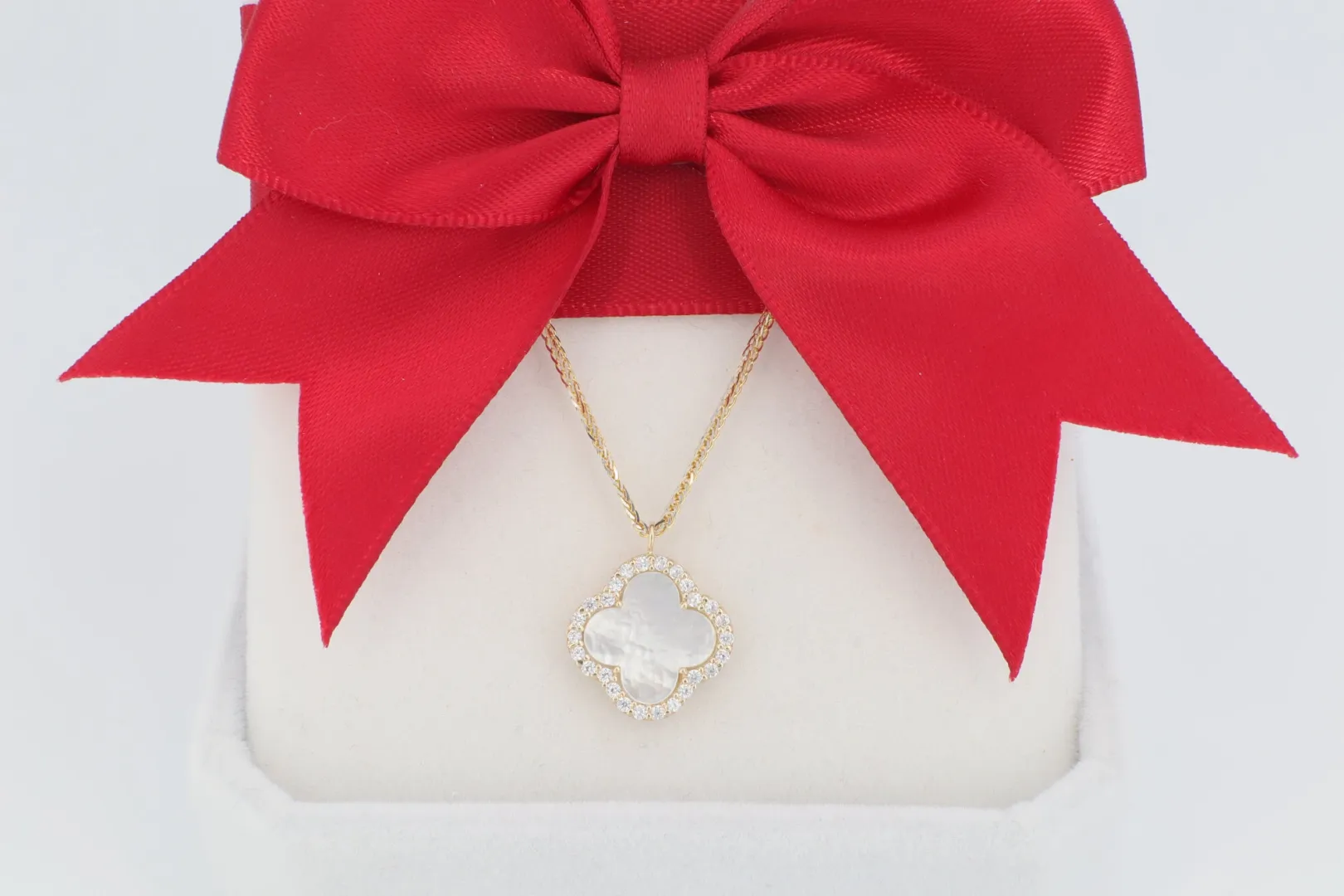 Ez a 14 karátos arany nyaklánc a szerencse és az időtlen elegancia szimbolikus darabja, amelyet a klasszikus lóhere (Alhambra) motívum ihletett. A medál egy stilizált, négyszirmú lóherét ábrázol, melynek központi eleme egy fénylő, természetes gyöngyház (sedef) betét. Ezt a gyöngyházt elegáns cirkónia kövekkel kirakott arany keret veszi körül, ami maximalizálja a csillogást és kiemeli a betét tejfehér ragyogását. A design a klasszikus stílusú luxus ékszerek rajongóinak készült.